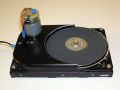 Nakonec jsem z disku demontoval veškerou elektroniku a mechaniku snímacích hlav. Zůstal disk s motorem a dvoudílné hliníkové těleso. Motor s diskem jsem demontoval, ze spodní části tělesa, odstranil přívodní kablíky a na plášť, který je současně rotorem, navlékl pryžový O-kroužek 80x3mm (průměr kroužku 80mm, průměr šňůry 3mm) a namontoval motor na původní místo. Disk jsem z motoru raději nedemontoval, neboť bylo zřejmé, že je s rotorem vyvážen a demontáž by vyvážení porušila. Do horního víka šasi jsem lupenkovou pilou vyřízl kruhový otvor o průměru o málo větším než průměr disku, tak aby v přední části víka rovina disku byla mírně nad seříznutým víkem (je to patrné na fotografii). Motor jsem vytáhl z krabice starých zásob, jedná se o neznámý typ, velikostí srovnatelný se Speed 400 na napětí 12V. Hřídel motoru je třeba zkrátit tak, aby se vešel do meziprostoru v šasi.