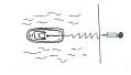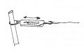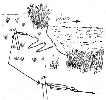 Pro další postup je nejlepší, aby vítr vál do zad. Pro zajištění bezpečného kotevního místa zatlučte ocelový kolík do země cca 1/2 m od linie břehu. Kolík se NESMÍ kývat. Přesvědčte se, že tažné lano vede volně k vodě a že nehrozí zachycení o jakékoliv překážky. POZNÁMKA: Pokud použití kolíku není vhodné, je nutné najít jiný kotvící bod. Pokud není kroužek mincíře v přímém kontaktu s kotevním kolíkem, mohou být odečtené hodnoty tahu zatíženy chybou.