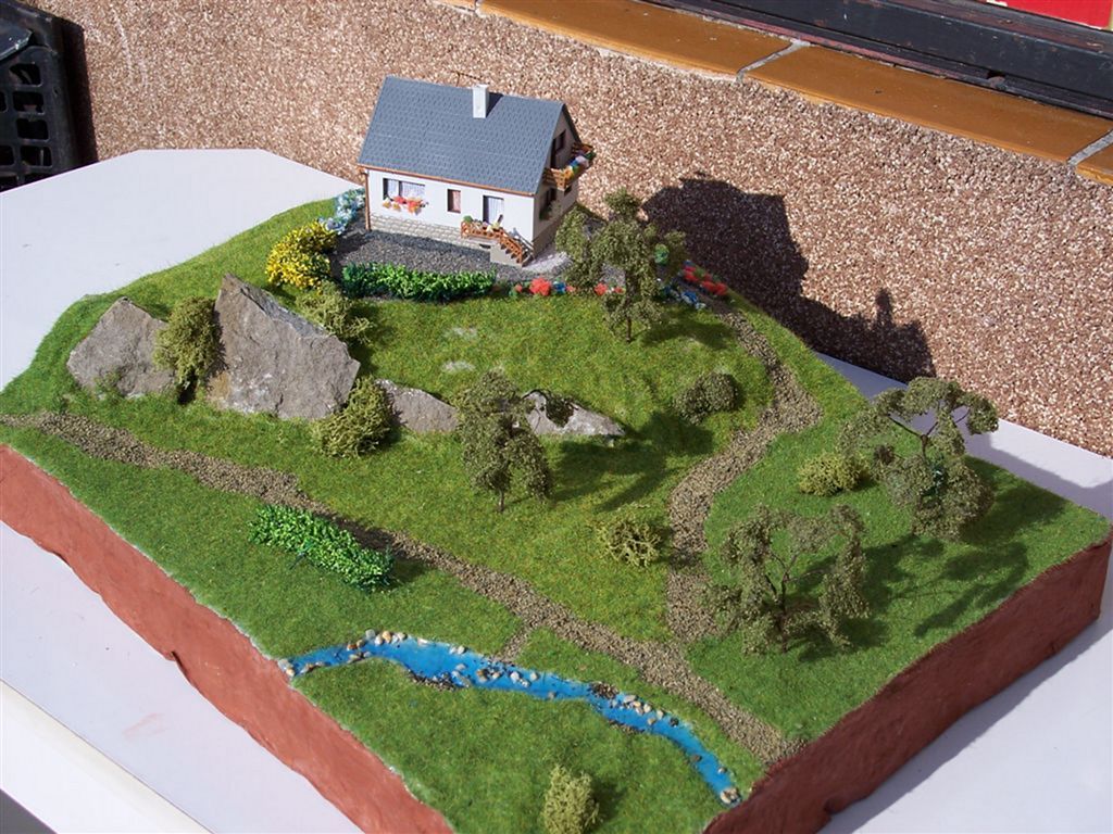 Jednodušší krajinka má rozměr 25 x 15 cm. Její součástí je jednoduchý domek. Chodníčky jsou vysypány štěrkem a na trávníky je použita statická tráva. Malí modeláři pak tvoří květinové záhony a tvarují živé ploty.