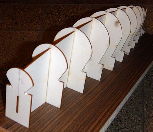 . Je to daň snaze docílit co nejnižší váhu, náš trup má necelých 60 g. Musíme tedy řešit dříve neznámý problém, jak zajistit osazení trupu dalšími prvky bez zdeformování jeho tvaru. Spoléhat na genialitu a slepení všeho od oka v ruce nechceme, tak Honza usedá k PC a s využitím dat trupu kreslí dělenou vnější konstrukci. Do takto vytvořené vnější konstrukce laminátovou skořepinu musíme přesně ustavit, k tomu využíváme hrany trupu, pro kontrolu i průběh hrany mezi boky a dnem. Jde o poměrně zdlouhavou práci, při které si pomáháme pomocnými příčníky a také vnitřními žebry. Jakmile jsme spokojeni s ustavením trupu, tak lepíme na boky balzové pomocné lišty, na jejichž horní hranu přijde přilepit paluba. Ve vnitřních žebrech jsou vyříznuté dorazy a tak postupně na oba boky lišty přilepíme. Také vlepíme na svoje místo balzové příďové a záďové žebro. Po dokončení trupu bude záď šikmo seříznutá podobně jako na předchozích typech.