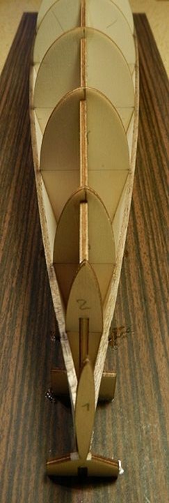 Po slepení konstrukce z březové překližky tl. 3 mm došlo na obšívku z 3mm balzy. Nejprve boky z plátů balzy, která šla překroutit do tvaru i bez namáčení.