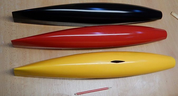 Pod latexem vidíme velké vzduchové bubliny, ty jdou válečkem vytlačit poměrně dobře, ale mikro bublinky vzdorují a někdy se je nedaří eliminovat. Po zatvrdnutí pryskyřice jde latex snadno sejmout a my vidíme, nakolik se nám podařil povrch trupu. Naše pokusy nejsou takové, že bychom mohli s klidným svědomím trup přímo použít, proto přichází ke slovu plnič, broušení, základ, broušení a finální barva. Na obrázku je první trup žluté barvy určený k testům dalších postupů, červený je první „ostrý” trup a černou barvu má kopyto. Před sejmutím polotovaru trupu z kopyta jej zařezáváme s hranou paluby, sejmutí je bez problémů, postačuje na hraně lehce odchlípnout a podfouknout stlačeným vzduchem.