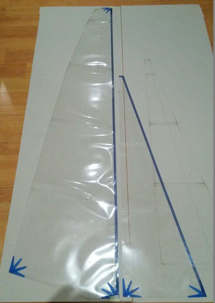 Ve stručnosti tedy zmíním mnou užívaný postup. Narýsuji si půdorysný tvar hlavní plachty (main) i kosatky s rozdělením na jednotlivé díly (bány) a s vyznačením vrcholu profilu plachty. Překryv jednotlivých dílů je 6 mm, tím získám rozměry jednotlivých dílů, které vyříznu s rezervou na přední i zadní straně. Na každý díl si vyznačím polohu vrcholu profilu a nalepím si na jednu „spojovou” stranu pásek oboustranné pásky, ze které nesundávám ochrannou folii. Není úplně jednoduché pásku nalepit na správné místo, rovně a bez nežádoucího napětí. Opět doporučuji zkušenosti z webu RG65.sk, kde jsou vidět užitečné rady v praxi.
