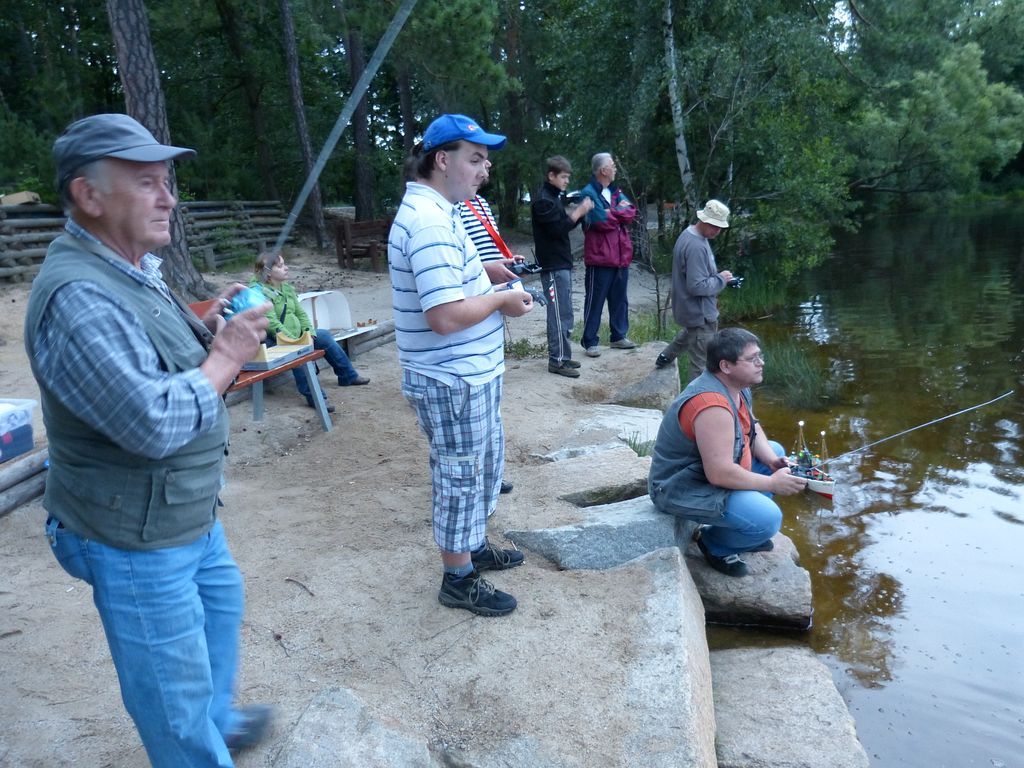 Bleskově jsem vypil čaj, Bohouš pivo a šli jsme se ven přivítat se Stanislavem Jíšou. Jak se blížila osmá večerní, přijížděli další. Jen Tomáš Blahůtka stále nikde. Po čtvrthodinové debatě jsem, ač se tomu doposud divím, navrhl, že by bylo vhodné nanosit modely k vodě, když už jsme se tu v tak hojném počtu sešli.
