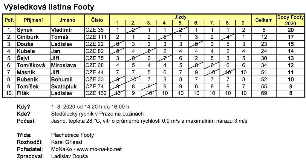 Sám jsem Springera na vodu nevyslal, jelikož tou dobou byl již zpátky na jihu Čech (Bohouš chvátal na jakousi soutěž dobrovolných hasičů ve večerních hodinách). Jakkoli jsem se nemohl zapojit do srazu, soutěžní část jsem si užil dosyta. Nejprve to bylo třetí místo s Footynou v rámci druhé soutěže pětidílného seriálu Footy v Čechách 2020, kdy před mou maličkostí skončil Tomáš Ciniburk a s bezpečným náskokem zvítězil Vladimír Synek.