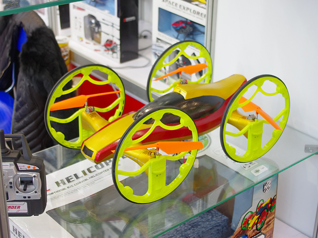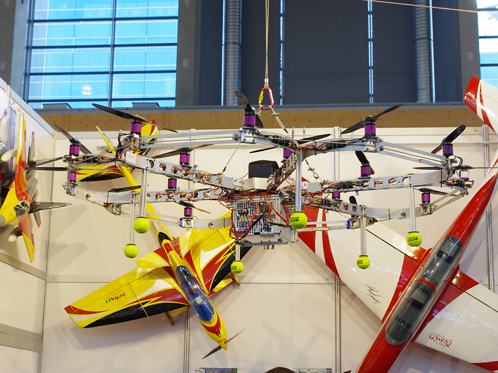 Ještě před dvěma roky byly všude jednoduché hračky podle jednotného vzoru: solární článek - motorek z mobilu - něco se hýbe. Ať už za to může vystřízlivění z až fanatické propagace solárních zdrojů nebo snad změna dotační politiky, letos podobné výrobky téměř vymizely. V oblasti funkčního leteckého modelářství pozici ještě loni nesmírně populárních minivrtulníků zaujaly především tetracoptery s elektronickou stabilizací letu. Miniaturní jsou určeny na létání doma, větší nosí fotoaparáty nebo kamery a předávají obraz na zem přímo na displej vysílače, v němž může být rovnou zabudován i výukový simulátor řízení. Z některých strojů jde až trochu strach jak vyrostly, třeba ten na stánku Hacker měl 18 výkonných motorů a průměr něco kolem 2 m. V oblasti lodních modelů mě zaujalo několik věcí, ale netroufám si tvrdit, že jejich výběr poskytuje ucelený pohled na sortiment novinek.