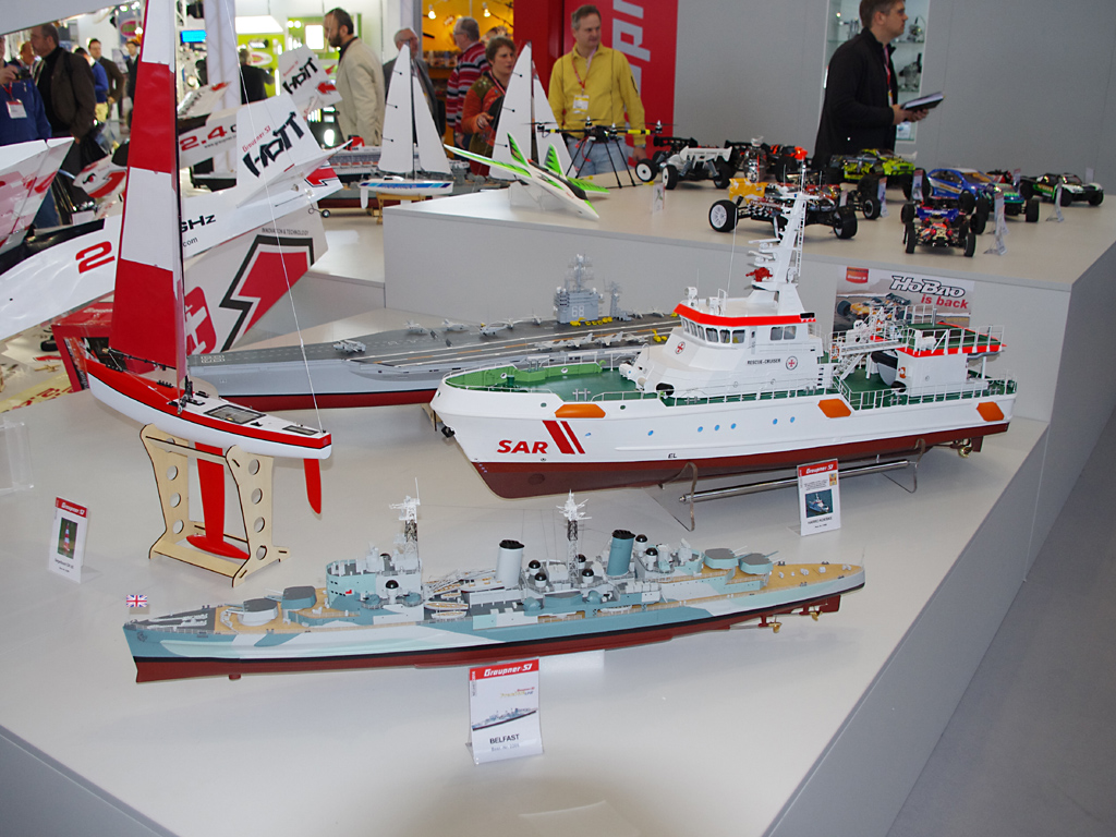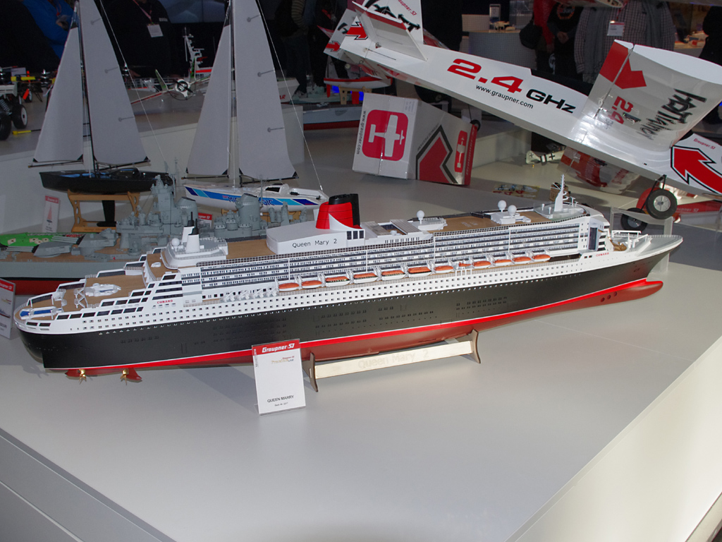 Firma Graupner vystavovala překvapivě mnoho lodí, většinou hotových modelů, které sice srovnání se soutěžními maketami nesnesou, ale jsou poměrně pohledné s více detaily. Asi největší z nich byly Queen Mary 2 (měřítko nebylo uvedeno), bitevní loď USS Missouri (1:150) a letadlová loď USS Nimitz (1:200). Zástupce firmy nás opakovaně upozorňoval i na dvě zbrusu nové ponorky, z těch se ale nakonec „vyklubaly“ RC modely do akvária prakticky totožné s U-16, která se prodává už několik roků. Na minimodel jsou překvapivě kvalitní se statickým ponořováním, ale změna „karoserie“ není zas až tak převratná.