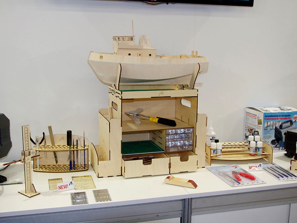 Pěkná pomůcka byla na stánku Artesanía Latina, dřevěný pracovní box včetně stojanu na loď, držáčků na nářadí i lepidla a třeba přípravku na kreslení čáry ponoru by mohl sloužit jako inspirace pro vlastní výrobu „dílny v kufru“.