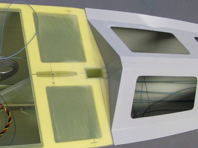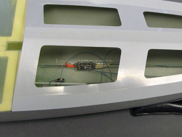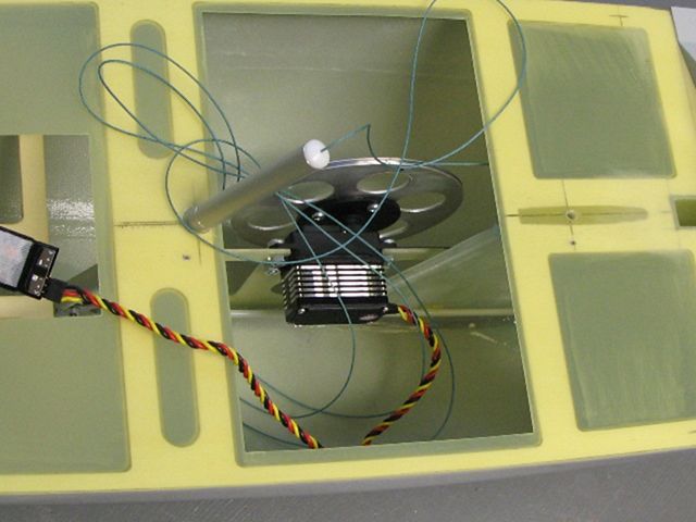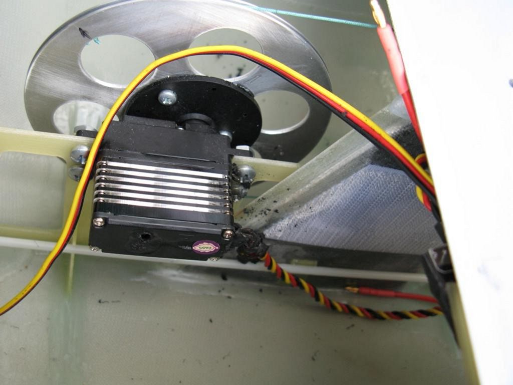 Pro servo kormidla (HS 646WP) je jednoduše přilepená, vyztužená deska z 3mm topolové překližky, opět napuštěná pryskyřicí. Servo s kormidlem je spojené pomocí dvouramenných, pák a dvou táhel - to zabezpečí, že kormidlo funguje prakticky bez vůle.