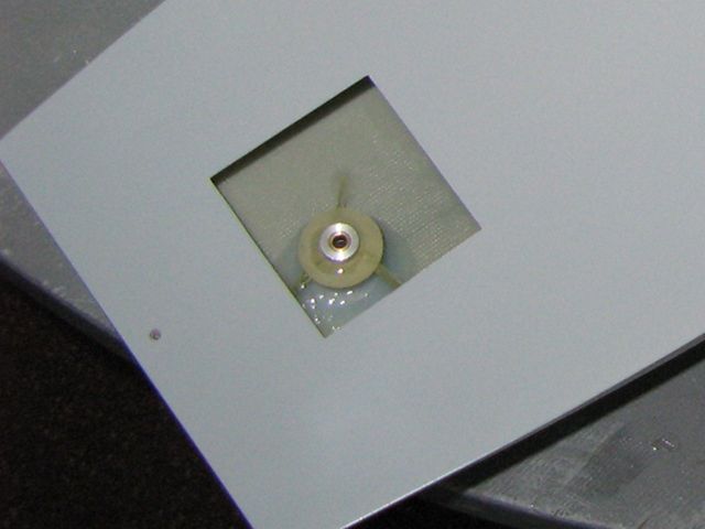 Na servu, nastaveném na 180 stupňů otáčení, je umístěná kladka z 3mm duralu, vypálená na laseru a následně obrobená na soustruhu.