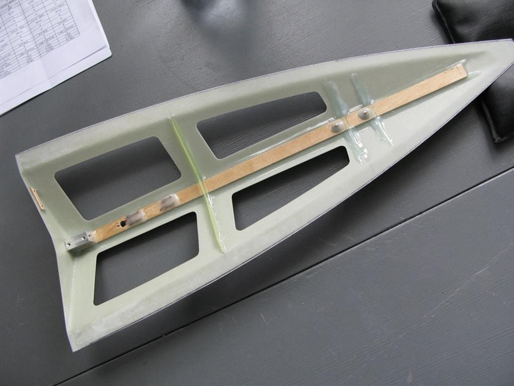 Kapsa pro stěžeň je nejdříve slepená vteřiňákem z 1mm laminátu a následně zvenku přelaminovaná asi šesti vrstvami 33g skelné tkaniny. Takto jemná tkanina se dá jednoduše natáčet na kapsu a nevznikají přitom bubliny v pryskyřici. Kapsa je mírně lichoběžníkového průřezu, aby umožňovala sklon stěžně směrem k zádi (5 stupňů) a její vnitřní šířka je 12 mm a fous, neboť jsem počítal s max. průměrem stěžně 12 mm.