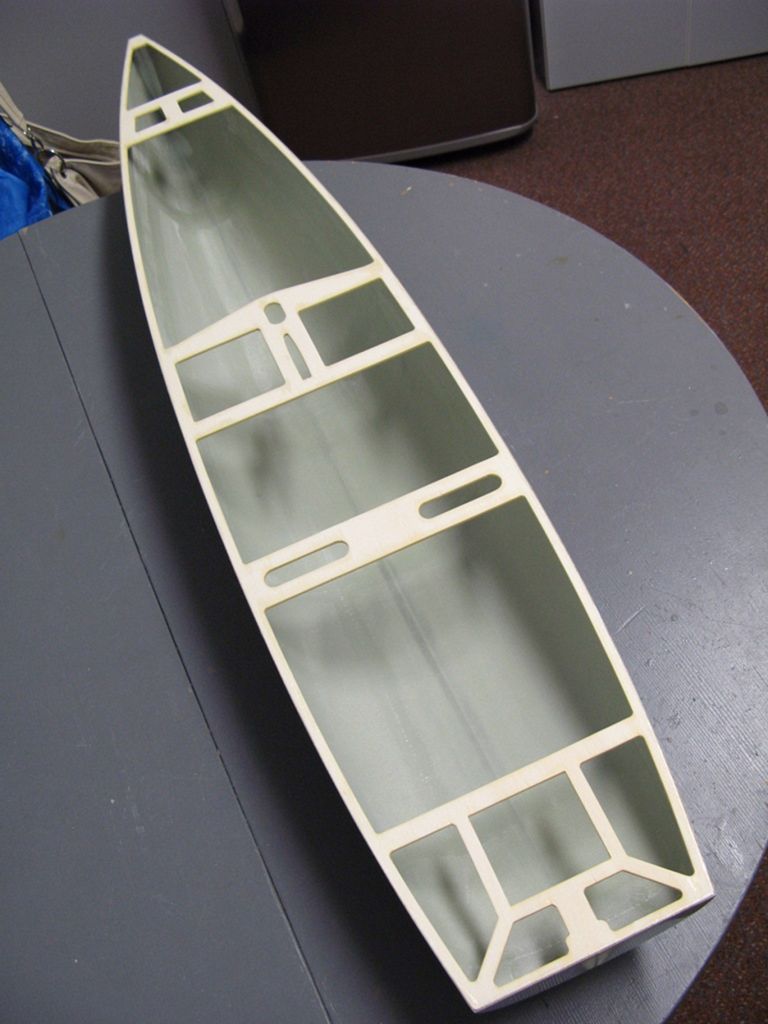 Tím jsem vlastně dokončil laminování všech potřebných dílů, protože zadní část paluby je vyrobená z 0,5mm laminátové desky. Oproti originálu Noux je tedy zadní část paluby rovná, zvednutá směrem nahoru a tím se posune lehce i těžiště oplachtění směrem vzhůru. To není sice optimální (měřící bod na palubě vztahující se ke stěžni, je tedy výše - viz IOM rules), ale bylo to vynucené plánovaným způsobem ovládáním otěží - servo s velkou (100 mm průměr) kladkou. Pod palubou je umístěná „falšpaluba“ z 3mm topolové překližky, vystrouhaná na CNC a následně napuštěná pryskyřicí. Po přilepení k trupu vteřinovým lepidlem, je odspodu po celém obvodu přilaminovaná rovingem ze skelných vláken. Tímto se celý obvod trupu výrazně zpevní.