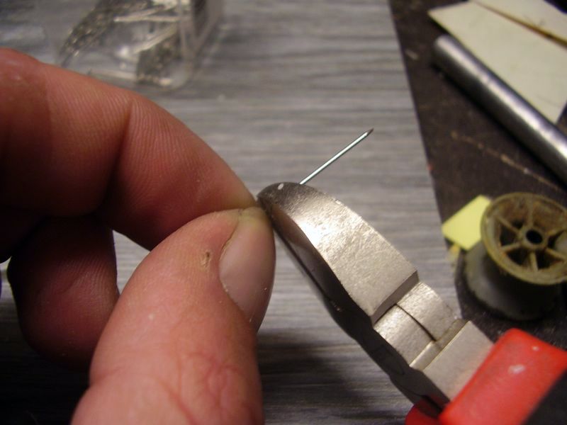 Ze špendlíků bude potřeba jen hlavička s kouskem těla. Jde snadno oštípnou. Nejdříve jsem držel hlavičku v kleštích, ale je to zbytečne, snadno ji udržíte v prstech. Připravíme si dostatečné množství, raději více, než potřebujeme, skáčou občas z pinzenty, potvůrky.![]()