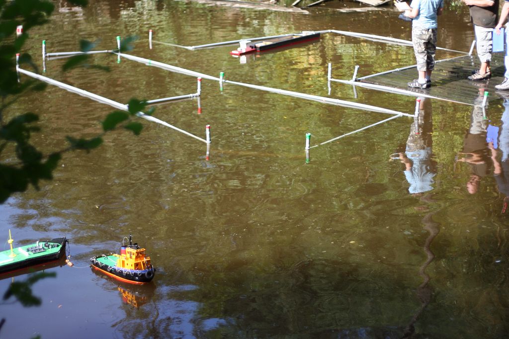 Čas však neúprosně tlačil a nechtěl ani chvilku počkat. Po průjezdu trati byl stanoven velkorysý limit 15 minut. Nezbytná porada rozhodčích, kde jsme si vyjasnili, jak kterou překážku pískat a Keba do megafonu prohlásil „5 minut do startu a odevzdejte vysílačky“. Za každou vysílačku jste vyfasovali kolíček s číslem, docela nevýhodný kšeft. Někteří si podle vysílačky nechali, ale ukázalo se být vše v pořádku, protože zamířili rovnou na trať. Lehké TT jelo tradičně s malým Kačerem (šroub byl dodán), těžké TT vyrazilo s ropnou plošinou a tlačáky s vanou od Fóglů, která je delší než tradiční. Všichni čekali na to, jak se první kapitáni popasují s tratí. Trať byla poměrně milosrdná, jen kolem majáku občas vznikla poměrně složitá situace. Občas se zvedl velký vítr a maják se rozhodl změnit místo. Proti pátku nám klesla trochu voda, což bylo na bójkách znát. Vypsaný kurs nešlo projet najednou, do některých branek se vyplatilo si udělat propagační kolečko a najet si lépe. Od samého začátku jsme zvolili naprosto nekompromisní nahánění týmů na start. V tom nám hodně pomohla Monika s Lenkou, které se staraly o počítání výsledků a organizaci před startem. Díky radiovysílačkám byl neustále přehled o tom, kdo se má připravovat, protože jakmile se tým objevil před přístavem, už jsme dávali pokyn dalšímu týmu, aby se začal připravovat. Díky tomu se nám podařilo na trati udržet čilý provoz a dodržovat časový plán. Na týmech je vidět už jejich vyježděnost a tak se žádné větší problémy nekonaly. Některé týmy se rozhodly vylézt mezi diváky na kamennou zídku, odkud bylo dobře vidět do zadního kanálu. Diváků bylo poměrně dost, ale do prostoru soutěžících neměli přístup a nejlepší výhled byl oddělen, takže jsme se vzájemně nerušili. První kolo jsme zvládli ve slušném tempu, dva týmy pravda nedokázaly vyjet ani z přístavu, ale jinak vše šlo víceméně v pohodě.