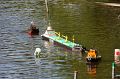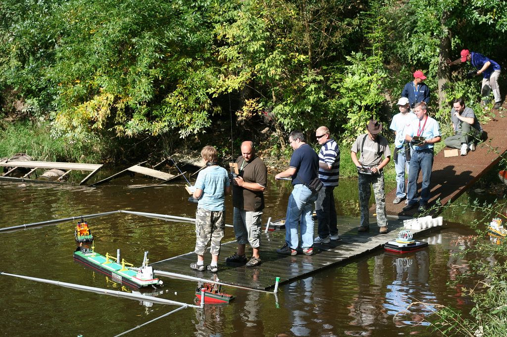 Startovní listina byla značně nabitá a čas neúprosný. Start jsme museli posunout z 12 hodin na 10. Slezská šlechta neponechala nic náhodě a jako obyčejně se postarala o to, abych snad náhodou nezaspal. Vlakem se rozhodli přijet v 7:30 na Hlavní nádraží. Tak jsem Marka alespoň zneužil k tomu, aby mi namixoval pohony a vyrazili jsme směr Braník. To co se tam dělo, jste ještě neviděli. Nebylo kde zaparkovat, všechna místa byla obsazená, tolik lodních modelářů snad ani není. Nedalo se nic dělat, rozhrnul jsem cyklisty a dojel až ke klubovně, kam se normálně nesmí. Na druhou stranu jsem vezl maso na grilování, takže jsem měl vlastně status zásobování. Na zahradě před klubovnou byla spousta přízraků s krvavýma očima, všude lodě. Při bližším pohledu se ukázalo, že jsou to téměř všichni startující. Láska k TT je prostě bezbřehá. Všechny ty lidi přinutila vylézt z vyhřátých postelí, hnát se někam k Vltavě a ještě se tvářit nadšeně, že tam jsou. Tahle parta lidí je prostě skvělá. Rychlé kontroly lodí a nezbytný pokec s ostatními. Vesměs se účastnily lodě, které už k vidění na nějaké soutěži byly. Jedinou novinkou byl snad jen Makův přerostlý Springer Karusel. Ač karusely zatím nikomu nefungovaly, tenhle kupodivu ano. Zajímavou novinku předvedl Luděk se svým Sisyfem. Už ho přestalo bavit každému odpovídat na to, jak vyřešil osazení pohonů stříďáky a na Sisyfa prostě položil vytištěný papír, kde vše podrobně popsal . A rázem dotazů ubylo. Tohle řešení má rozhodně něco do sebe. Sisyfos je na vodě rozhodně FSR remorkér, pokud vyrazí na plný výkon, tak ho za gejzírem vody téměř nezahlédnete.