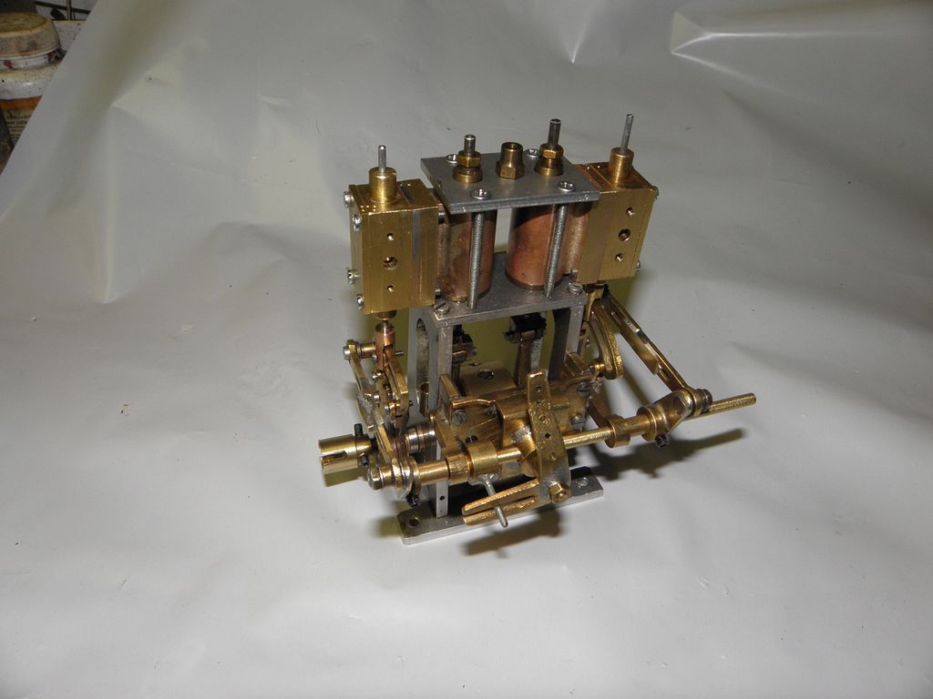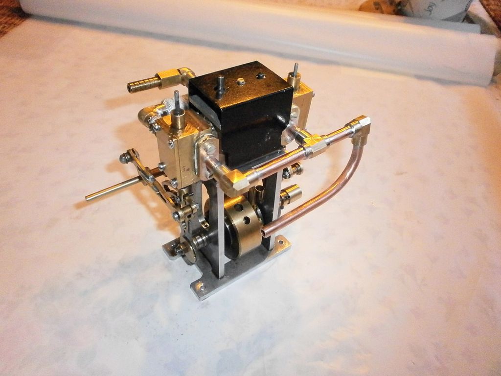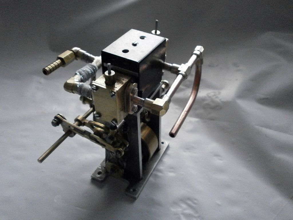 Excentry jsou tedy o těch asi 7 mm odsazeny od kliky vně, aby byly zhruba pod šoupátkovou komorou, trochu práce bylo s nastavením. Převod na přesun šoupátek podél jsem odkoukal od strojků Saito, kapota na válce, izolace trubiček na přívodní páru, ochlazovač a lapač kondenzátu a kotlík a je to… Není o čem prakticky psát, že?