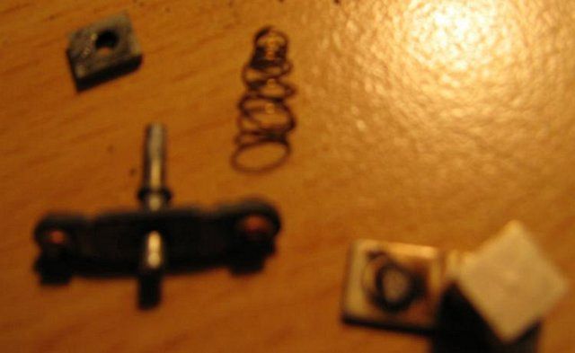 bude nutno vložit příčnou pružinu a pak správně plech záchytky a to celé zajistit tim , co vypadá jako nastřižená podložka