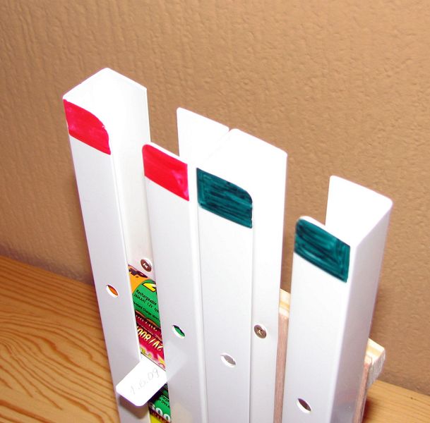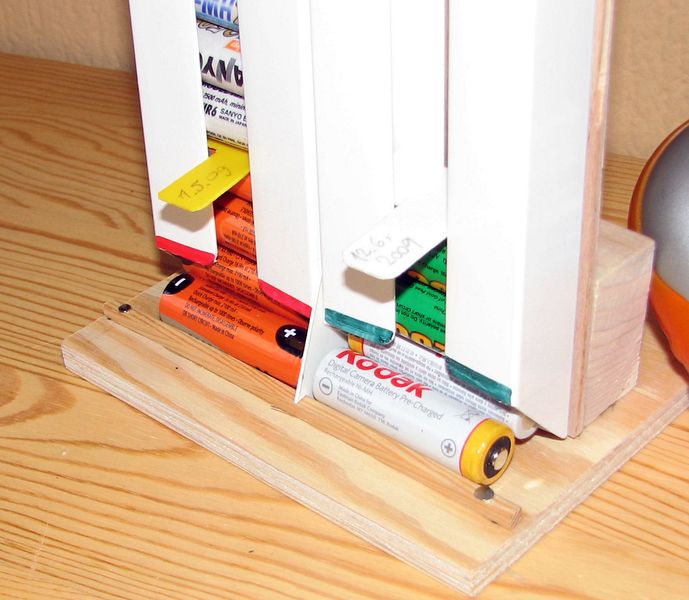 Uvědomil jsem si, že tužkové akumulátory používám většinou v sadách po čtyřech kusech a tomu vyhovuje i můj organizér. Jednoduše umožňuje roztřídit sady akumulátorů na vybité a nabité a přitom udržuje pořadí jak byly akumulátory vybity a nabity. Práce na organizéru mi trvaly zhruba dvě hodiny. Jako materiál jsem použil odřezky překližky a hranolků. Jako spojovací materiál jsem použil vruty. To nejdůležitější - plastové „U“ profily jsem koupil v jednom z těch supermarketů pro kutily.