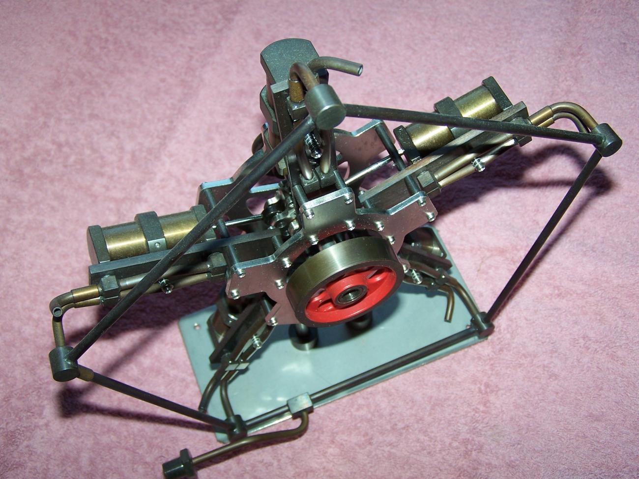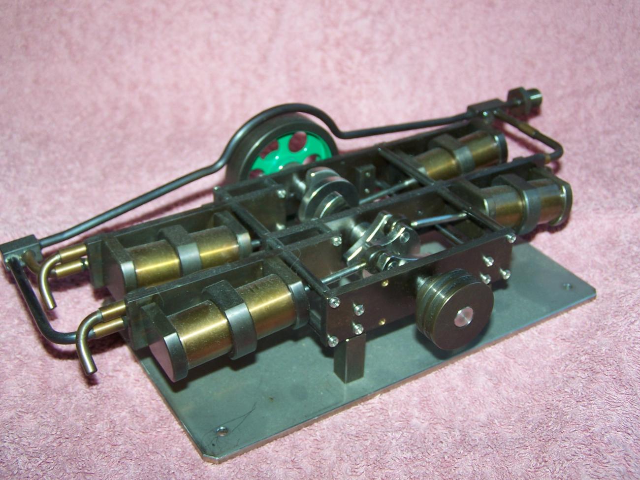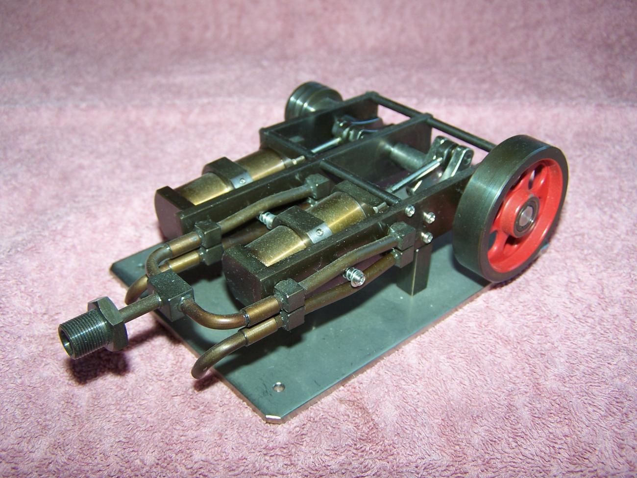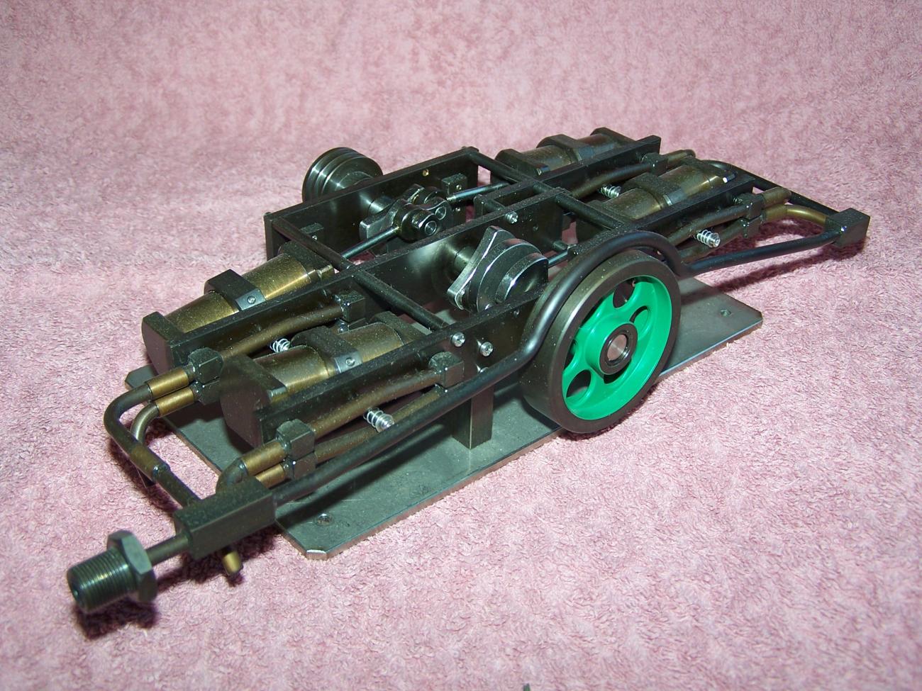 Asi před šesti roky jsem se rozhodl vyrobit (jen tak pro zábavu) univerzální dvojčinnou oscilační jednotku, kterou by bylo možné libovolně řadit do sestav a vytvářet tak víceválcové pohony. Vznikl tak základní jednoválec, dvouválec, řadový tříválec, protiběžný čtyřválec a hvězdicový pětiválec. Vrtání základní jednotky je 14 mm, zdvih 16 mm, tedy zdvihový objem 2,46 cm3 síla působící na píst při tlaku 2 bary je 3,8 N, kroutící moment na klikovém hřídeli je 2,46 Ncm. Pro lodní modely je použitelný ale pouze dvouválec, řadový tříválec a řadový čtyřválec (ten jsem sice neskládal, ale problém to není). Výhodou takto uspořádaných pohonů je ale to, že je v lodi můžeme usadit na stojato, nebo na ležato podle místa.