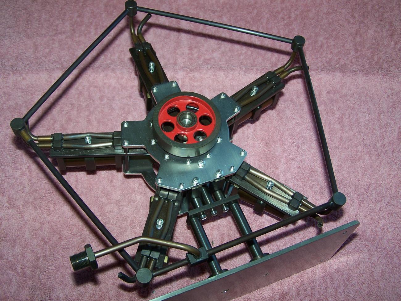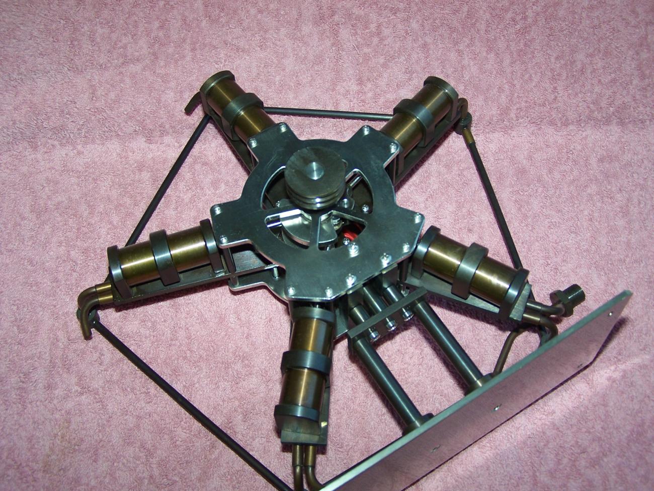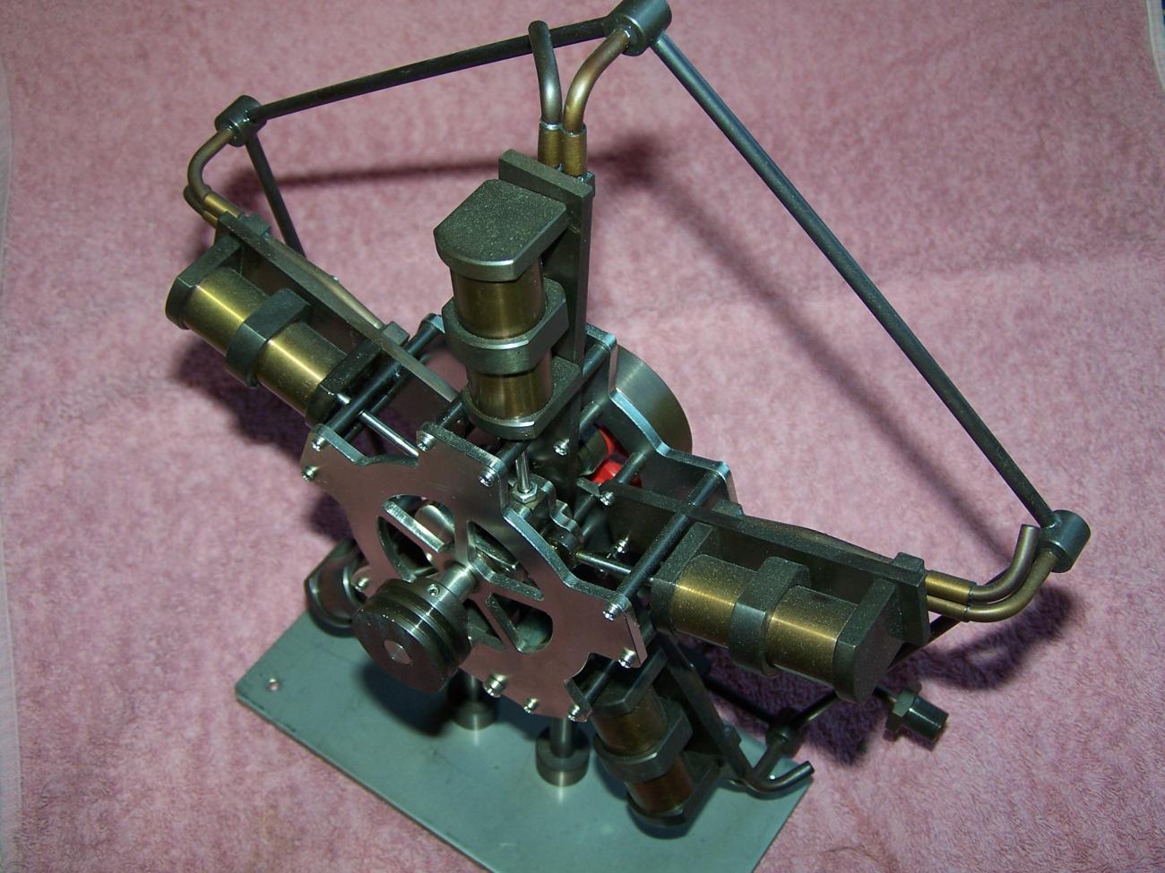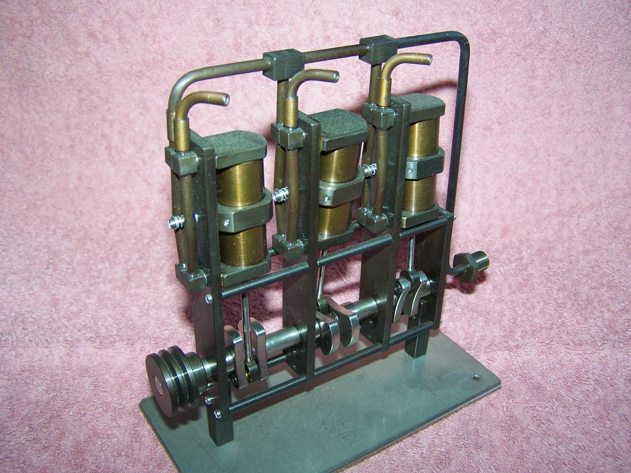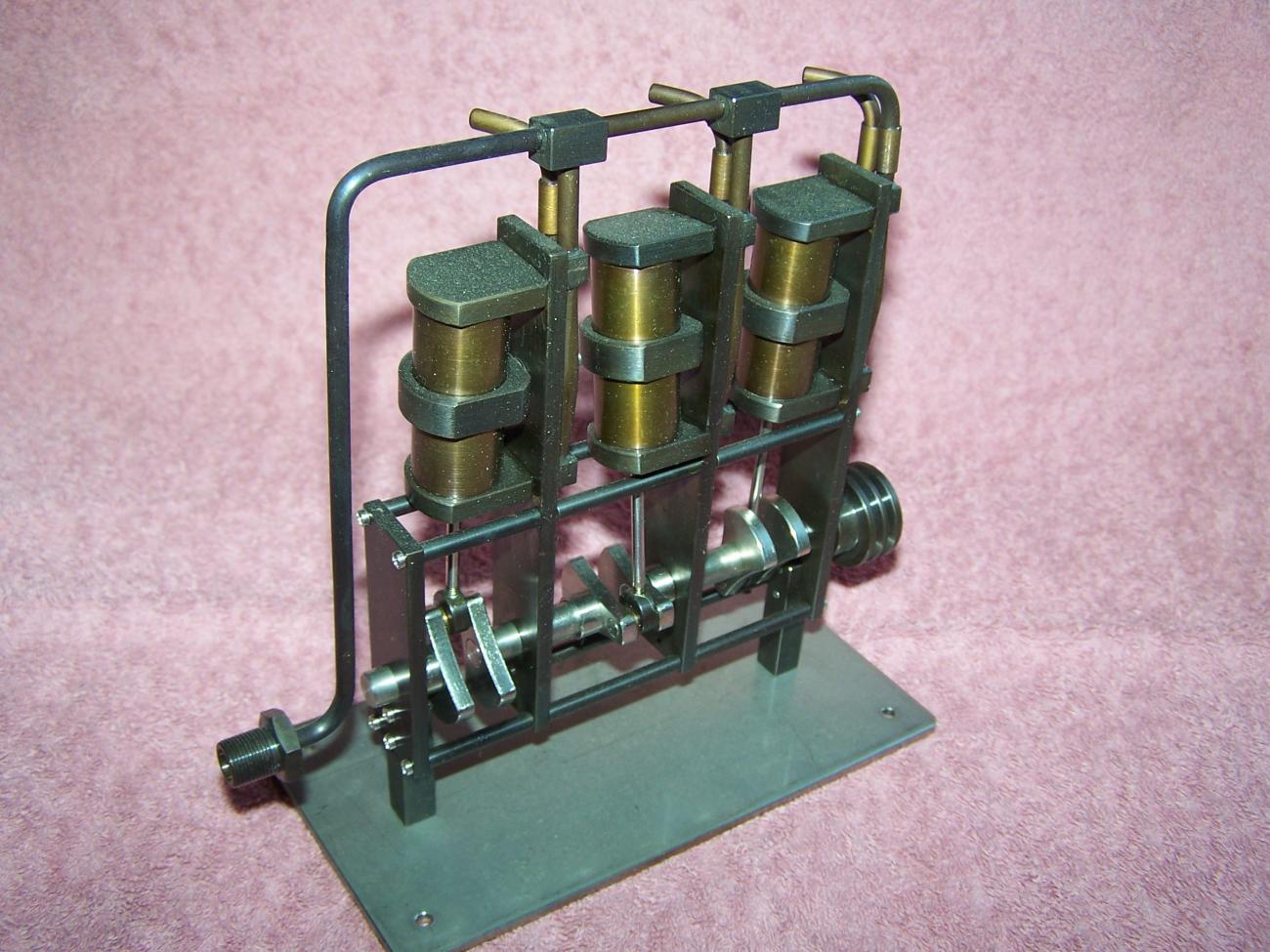 Asi před šesti roky jsem se rozhodl vyrobit (jen tak pro zábavu) univerzální dvojčinnou oscilační jednotku, kterou by bylo možné libovolně řadit do sestav a vytvářet tak víceválcové pohony. Vznikl tak základní jednoválec, dvouválec, řadový tříválec, protiběžný čtyřválec a hvězdicový pětiválec. Vrtání základní jednotky je 14 mm, zdvih 16 mm, tedy zdvihový objem 2,46 cm3 síla působící na píst při tlaku 2 bary je 3,8 N, kroutící moment na klikovém hřídeli je 2,46 Ncm. Pro lodní modely je použitelný ale pouze dvouválec, řadový tříválec a řadový čtyřválec (ten jsem sice neskládal, ale problém to není). Výhodou takto uspořádaných pohonů je ale to, že je v lodi můžeme usadit na stojato, nebo na ležato podle místa.