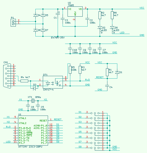 Reference Pcs Part Name Value Package ---------------------------------------------------------------------- C1 ... 1 x E470M/35V E470M/35V CR100 C2, C3, C5, C6, C7, C8, C9, C10 ... 8 x C 100n 0805 C4 ... 1 x C 10nF 0805 CN1 ... 1 x CAN9Z90 CAN9Z90 CAN9F D1, D3, D4, D5, D6, D7 ... 6 x D 1N4007SMD SOD80C D2, D8 ... 2 x LED LED3mm/1mA LEDC DT1 ... 1 x 4N25 CNY17-4 DIP6 J1, J2, J3, J4, J5, J6, J7, J8 ... 8 x J3.1S S1G3 S1G3 P1 ... 1 x ARK500/2 ARK500/2 ARK500_2 R1, R2, R3, R4, R6 ... 5 x R 4k7 0805 R5 ... 1 x R 220k 0805 U1 ... 1 x 2313 ATtiny2313-20PU DIP20 U2 ... 1 x 7805 7805 TO220 XT1 ... 1 x XTAL 8MHz XHC18V