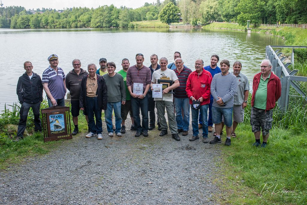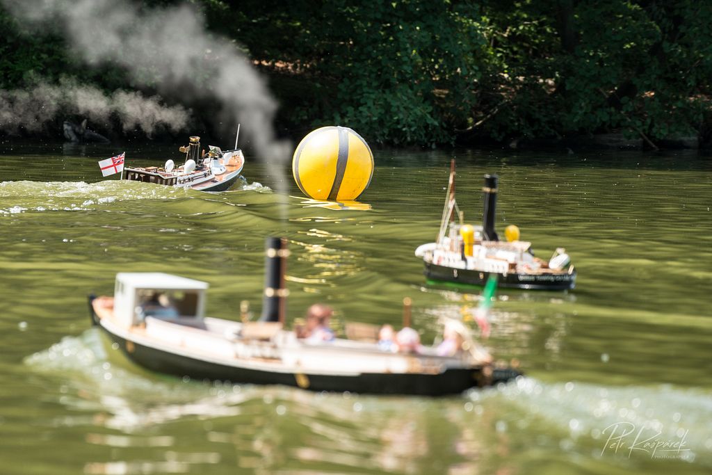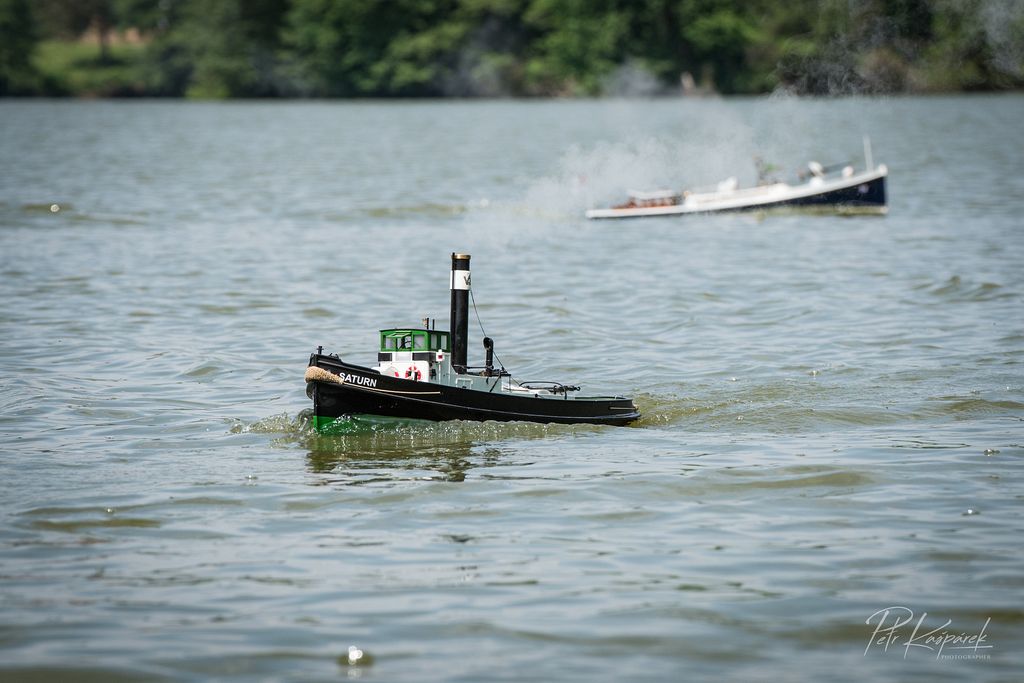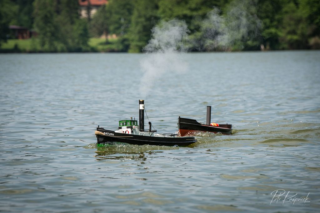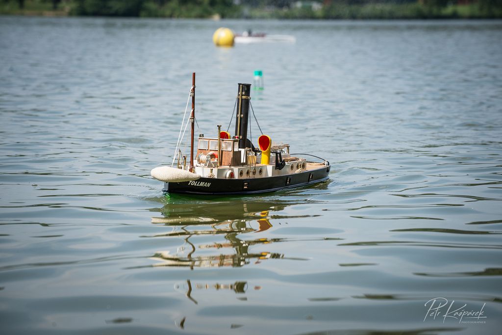 Poté do půlhodinového souboje vyplulo 13 parníků s lodním šroubem. Mezi nimi i můj Tollman, který sice rychlostní rekordy netrhá, ale vydrží plout takovou dobu. Co čert nechtěl, ještě před odstartováním se zastavil, když jsem chtěl kousek zacouvat. Až v klidu domova jsem spíše náhodou zjistil, že se na klikové hřídeli povolil červík a jeden z válců šlape naprázdno. Na stole vše fungovalo, protáčení nastalo až ve vodě.