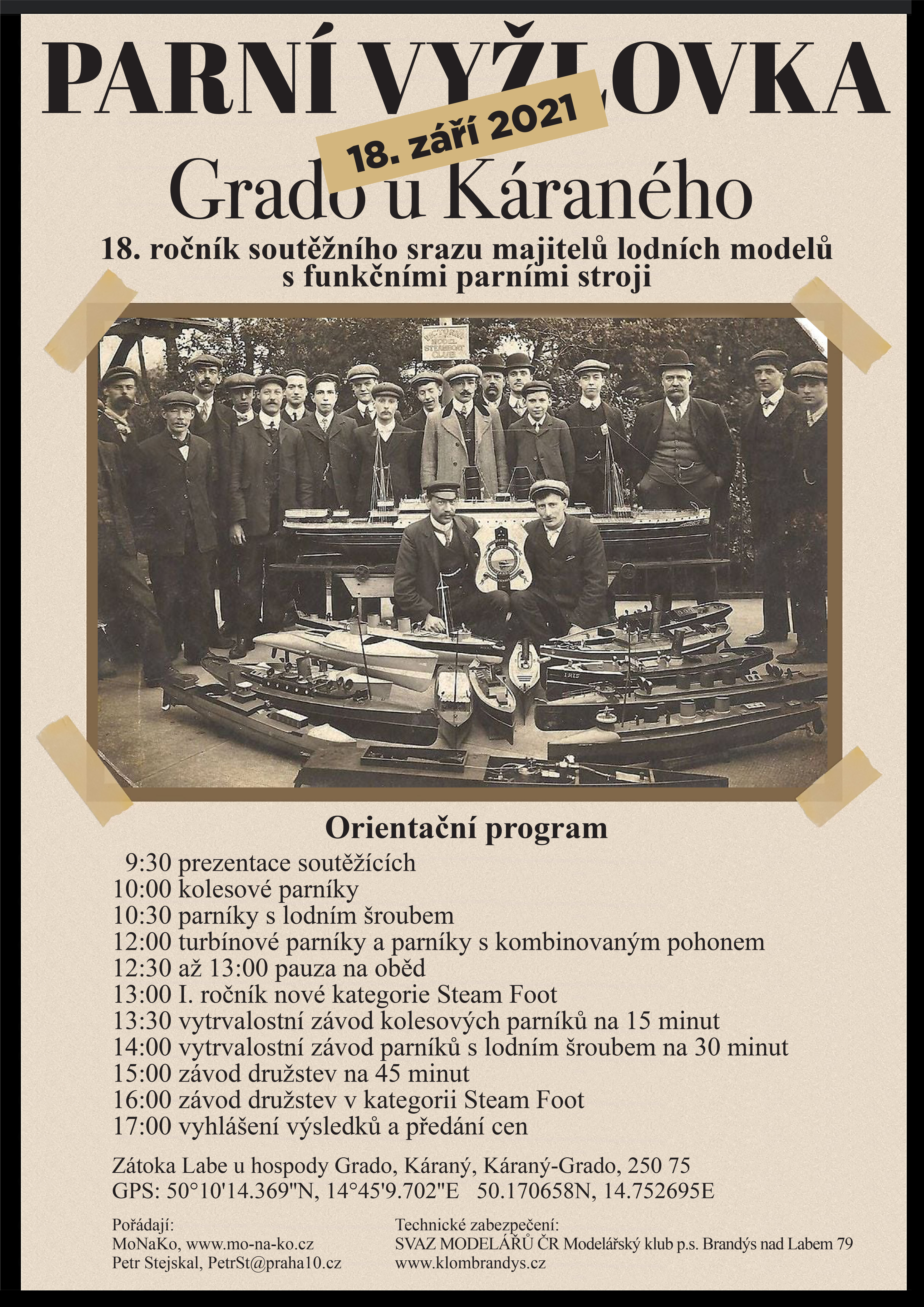 Celkem potřetí se příznivci modelů parníků s funkčními parními stroji sejdou na Gradu u Káraného. Stane se tak v sobotu 18. září úderem desáté dopoledne. Nicméně již o den dříve můžete přijít na kus řeči do nedalekých Říčních lázní Jizerka, kde bude dostatečný prostor probrat všechny novinky či si nechat poradit od špičky svého oboru.