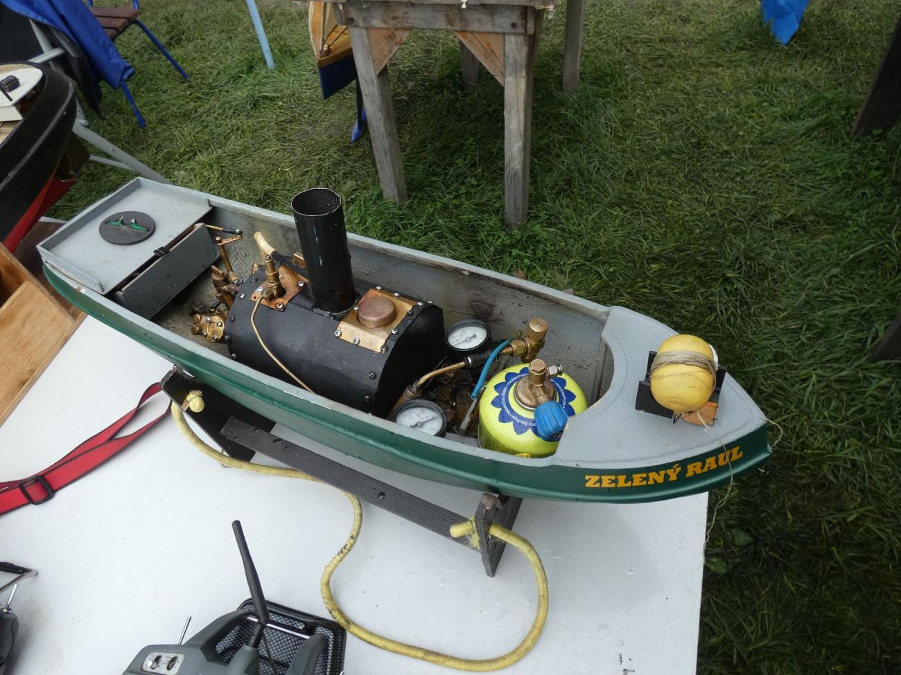 Poté již následovalo klání parníků třídy Steam Foot. S úderem startovního signálu projel startem jen jeden model, takže to pro Miroslava Beneše vypadalo velmi nadějně. Jenže za chvilku se objevil požár na palubě a bylo po naději. Metrová hořící koule vypadala dosti dramaticky, naštěstí se nikomu nic vážného nestalo. Jen Zelený Raul spolkne nějakou hodinu práce a Miroslav Beneš nemusí k holiči. Po několika minutách, které na tři kola bohatě stačí, zvítězil mezi pěti dalšími Green Ben Vladimíra Šrámka.
