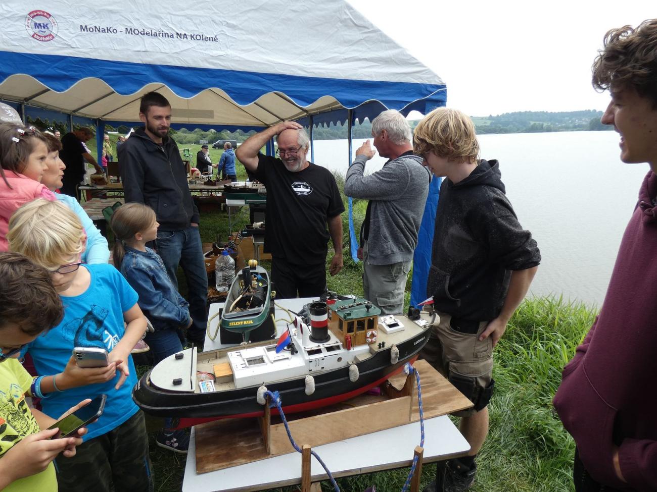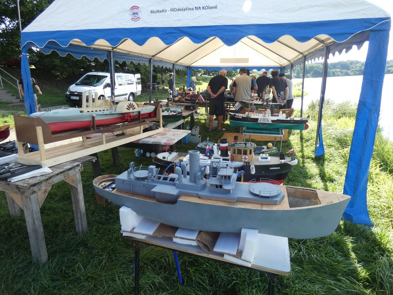 Původní představa, že u plovoucího mola postavíme velký stan, vzala rychle za své. Nevešel se. Celé startoviště se tak posunulo více vlevo a k vkládání modelů na vodu posloužila malá plážička. Plachetničkáři měli jako vždy gumovky, těm to nevadilo. Parníkáři si pomáhali vzájemně dle svých možností. Ne, že by byli líní popojít třicet metrů k molu, ale to se díky svému kolébání nejevilo zrovna vhodné k předklánění se k vodě s modelem v ruce.