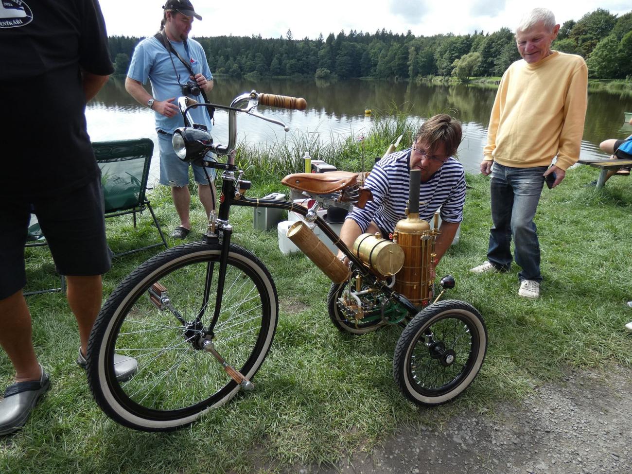 Každý, kdo aktivně tvoří, vytahoval hned u pozdního oběda své nejnovější dílenské výtvory v podobě kotlů či parních strojů, jen za dílem Michala Šenekela jsme museli ven. Přijel totiž na parní tříkolce. Ta budila pozornost i u nemodelářských hostů kempu, kteří ponejvíce chodili s trikolorou na klopě a spřádali plány, jak zatočí s Fialovo drahotou během generální stávky. Nutno říct, že si zvolili dobrý kemp, jelikož levnější ceny za ubytování jsem dlouho neviděl. Na druhou stranu je nutno říci, že na areálu za léta provozu zub času zapracoval a ubytovací standardy, zvláště pak u společných WC a koupelen, jsou dnes trochu jinde.