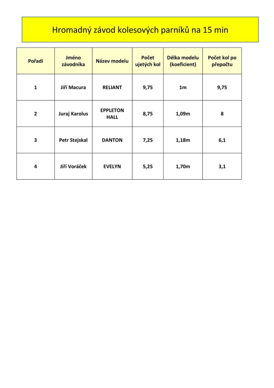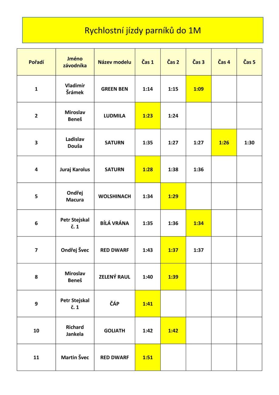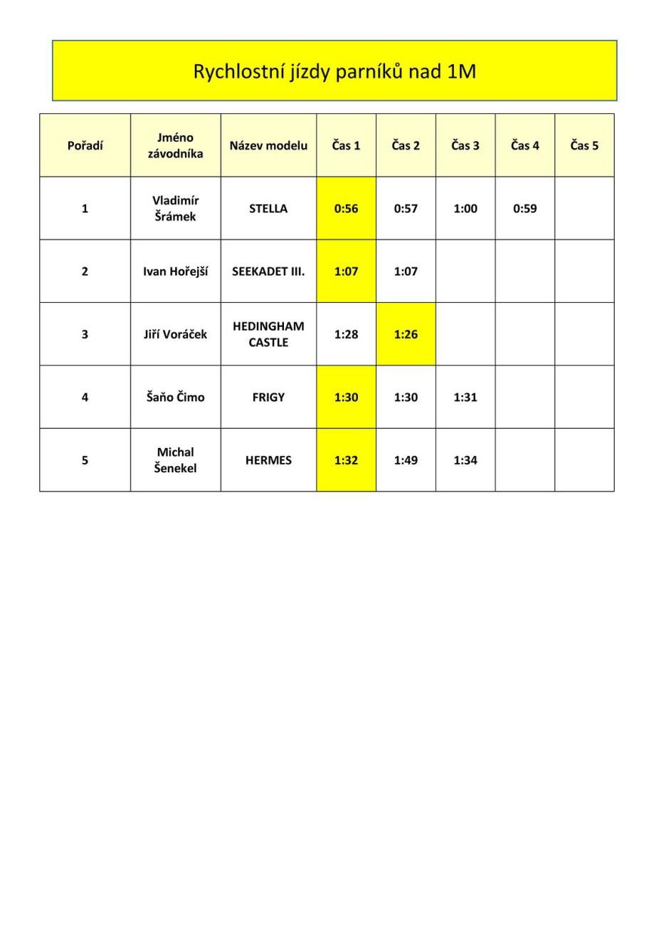Mezi parníky s délkou nad 1 metr nebylo tak natřískáno. Soutěžně vyplulo jen 5 kousků, přičemž nejrychlejší byla Sella Vladimíra Šrámka coby jediný parník s časem pod jednu minutu, a to pouhých 56 sekund.