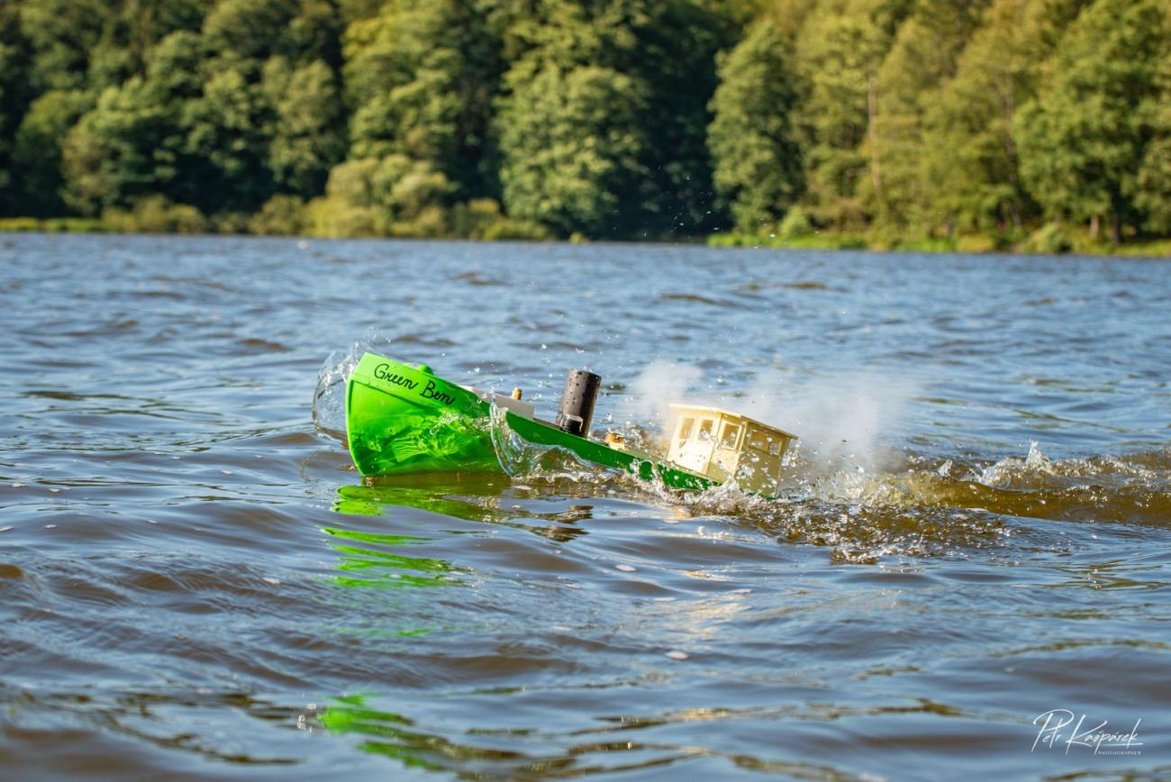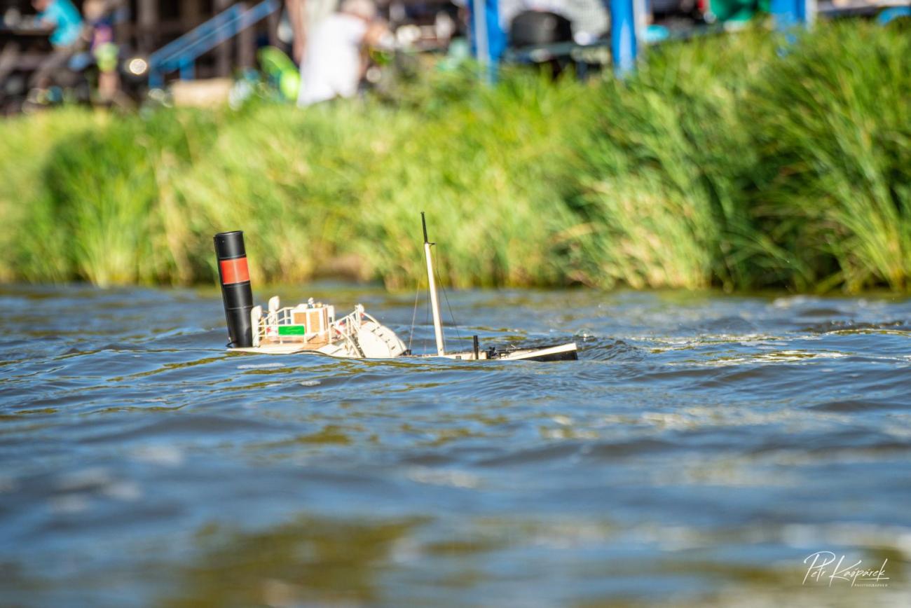 Petr Stejskal č. 1 coby hlavní pořadatel nejprve přítomným představil harmonogram soutěžních jízd. Sám v té chvíli ještě netušil, že zcela zbytečně. Z více než 25 modelů parníků svou soutěžní jízdu, která spočívala v obeplutí jednoduché trati v co nejkratším čase, během soboty úspěšně dokončilo jen 8 lodí. Jedna se málem utopila, další k tomu neměly daleko. Aby také ne, když se přímo ke břehu hnaly 30cm vlny. Soutěžní jízda z větší části spočívala v jízdě podél břehu a tedy s vlnami z boku. To je vražedná kombinace, pokud připustíme, že v modelech parníků musí být kvůli přívodu vzduchu spousta ventilačních otvorů.
