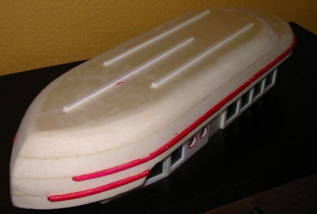 Celý trup vyřízněte z desky polystyrému silné 7-8 cm. Nejdříve nahrubo. V trupu vyřízněte a vydlabejte otvor do