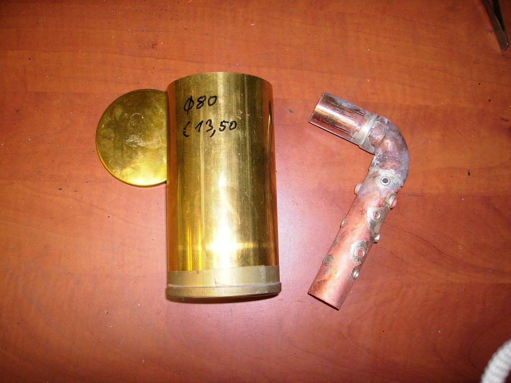 No, ale neméně důležité je mít přesně pasující a padnoucí součástky, takže došlo na jednu Ms trubku průměru 80 mm z Lipska a dvě dýnka po 6 Euro - na trubce je nápis jasně vidět. Rozhodl jsem se pro jednoduchý plamencový kotlík se šesti příčnými trubičkami, co dům dal - topenářská rourka Cu 28 mm s kolínkem.
