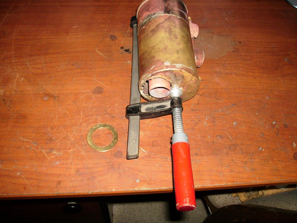 Odvrtat se to dalo už jen větším vrtákem, takže díra kolem plamence byla jako do stodoly a chvilku jsem si říkal, že to bude chtít novou přírubu, ale nakonec jsem vyrobil mezikruží a tím tu velkou díru uzavřel. Dokonce jsem musel přiložit mosazný drát 2mm průměru a celé to stříbrem převařil. To hlavní: Nakonec jsem vyrobil mosazné špunty a uzavřel jimi plamencovou trubku na obou koncích, spájel cínem a naplnil vodou - byla to práce jako na kostele -, a do ní začal dmýchat hořákem.