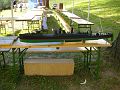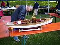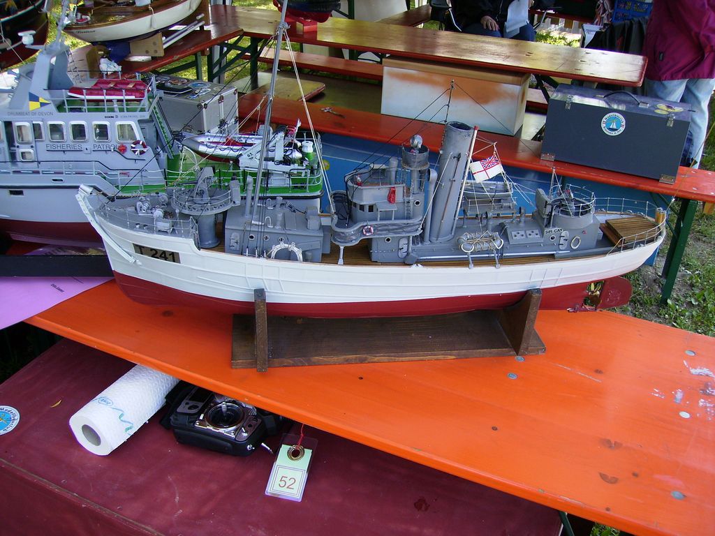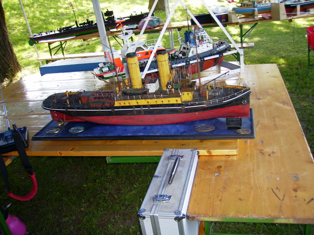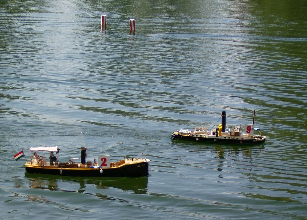 Houf lodí vyrazil zleva doprava. Každá má kolíčkem připnuté velké startovní číslo, aby tři soudci věděli, která uplavala kolik kol. Moje je druhá nejmenší. Trup vlečné lodi není to pravé ořechové, ale zase loď veze kotel asi 1,1 litru a to by mělo stačit i na tři čtvrtě hodiny. Samozřejmě jsem skoro nejpomalejší, ale loď krouží kolem dvou branek, jako by se nechumelilo půl hodiny, zatímco některé ostatní odpadávají. Kolem se po vnější straně pelotonu řítí Saddámova máma, nějaká rakouská torpédovka pana Michaela Fraumbauma s tříválcovým strojem, speciálem pro tento závod, který si Michael postavil podle vlastního návrhu. Na přírubách šoupátek má vyfrézováno velké F jako Fraumbaum. Je to hračička, a hlavně je to genius. Asi má v práci CNC mašiny, a tak udělal maximum.