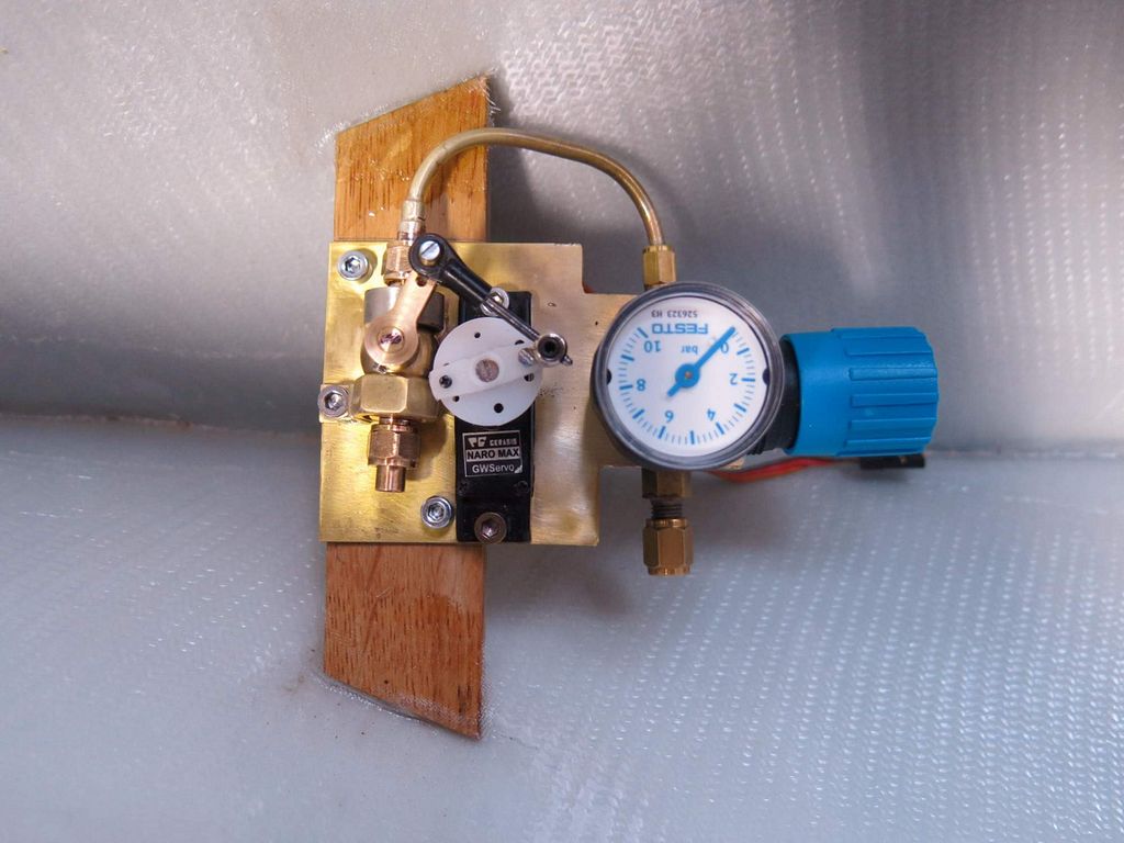 V prvom rade som sa začal venovať bezpečnosti plavby. V prípade, že ostane lodička v strede rybníka stáť, treba vypnúť plyn, aby neprehorel kotlík a nezhorela loď, ako Slaven. Tak som pod provu umiestnil uzatvárací ventil so servom. Plyn vstupuje do uzatváracieho ventila so servom, odtiaľ ide do regulačného ventila (udržuje rovnaký tlak na výstupe nezávisle od poklesu tlaku v plynojeme), z toho pokračuje do regulačného ventila, ktorý reguluje prietok plynu do horáka v závislosti od tlaku pary v kotli. Je nastavený tak, že pri tlaku 2 bar uškrtí plyn do horáka a pri poklese tlaku pary znovu otvorí plný prívod plynu.