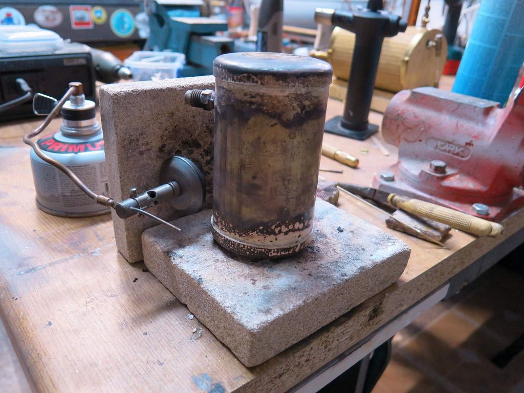 Na nádobe plynu je ďalší ventil, ktorý okrem uzatvárania plynu slúži aj na napľňanie plynojemu. Plynojem je osadený okrem uzatváracieho ventilu aj tzv. „odfukovým” ventilom, ktorý slúži na korektné naplnenie plynojemu. Pri plnení uzatváracim ventilom cez „odfukový” uniká plyn. Keď začne prúdiť v kvapalnej forme, zavriem prívod a aj „odfuk” a plynojem je správne naplnený. Plynojem, tak som nazval nádobu na plyn, som prirodzene podrobil predpísanej tlakovej skúške plynovej nádoby. Natlakoval som ju na 14 bar s tým, že pri skúške treba tlakovať dvojnásobkom prevádzkoveho tlaku. Nádobu s plynom (plynojem) som umiestnil nad kondenzátor kvôli ohrevu plynojemu (kondenzátor s plynojemom) z toho dôvodu, že pri úniku plynu z plynojemu prichádza k jeho ochladzovaniu a tým k poklesu tlaku plynu a tento jav naruší systém regulácie plynu a následne horenia.