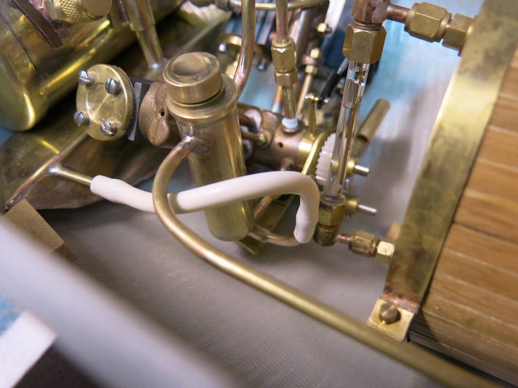 Rozmiestnenie vecí v trupe som riešil tak, aby bola prova odľahčená, nech lodička netlačí pred sebou veľkú vlnu. Stavoznak s elektródou čakajú na vhodnú elektroniku, ktorá bude signalizovať nízku hladinu vody v kotlíku. Žiadny parník nemôže byť bez píšťaly. Táto je od fy Wilesco. Petra Machatu čaká celkový pohľad do strojovne a samozrejme práca s palubou a nástavbou, pokiaľ sa tam niekde zmestia.