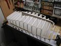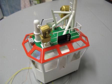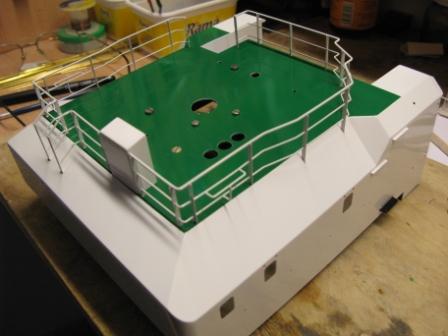 Zadní a střední část paluby je vyrobená z 1 mm laminátu a přilepená Letoxitem s mikrobalony (tedy řádně odspodu opatlaná). Přední část paluby je ze 4 mm překližky polepené 1 mm laminátem. Byl to sice zásah do hmotnosti lodi, ale tato část paluby současně složí pro ukotvení příďového úvazníku a tak mně to připadalo vhodné. všechny "dřevěné díly" jsou řádně natřené Letoxitem. Na střední části paluby byl vyroben límec pro uchycení nástavby a pak už byly třeba vyrobit domečky pro oděrné lišty a přední a zadní odrazníky. Domečky na boku jsou z 1 mm laminátu vypižlané do tvaru trupu přilepené vteřinovým lepidlem a následně vylité epoxidem s vložením naseparovaného kruhového gumového profilu. Pro separaci byla použita pasta na parkety.