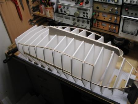 Trochu jsem se obával laminování trupu, protože tuto práci jsem ještě nedělal (doposud to byly trupy plaňkované), ale na Monaku je dost odkazů a poučení. Zvolil jsem pozitivní laminaci a kopyto vytvořil z Extruporu - žebra ze 6 mm a obšívku ze 3 mm. V místě, kde budou otočné dýzy ("Z pohony") jsem vložil 3 mm překližku pro zvýšení pevnosti. Obšívka je lepená Purexem. Vlastní laminování bylo provedeno pryskyřicí Letoxit a čtyřmi vrstvami skelné tkaniny (90, 120, 120, 90) zvenku i zevnitř. Část trupu u kýlu byla vyztužena uhlíkovým rovingem. Extrupor byl zhruba po úroveň čáry ponoru zanechán v trupu a výš vybroušený, tak aby paluba byla uchycena na "plném laminátu" a současně bylo možné vylaminovat borty. Stěna trupu je tedy cca. 1 mm laminátu - 3 mm extrupor - 1 mm laminátu a borty cca. 2 mm laminát.