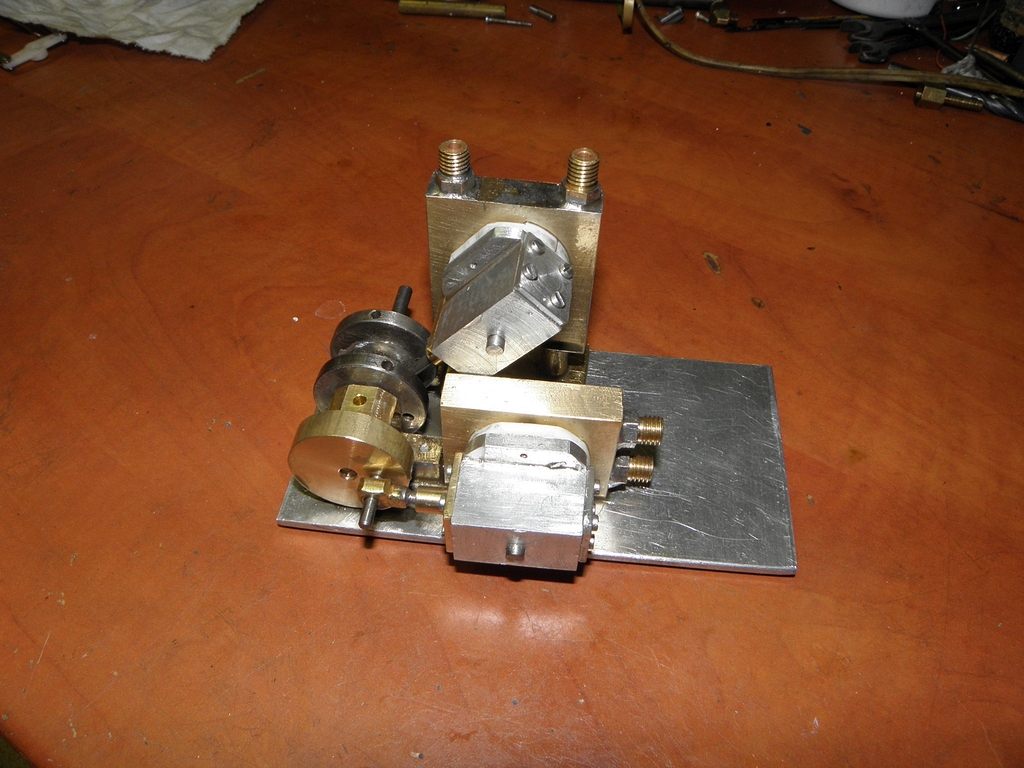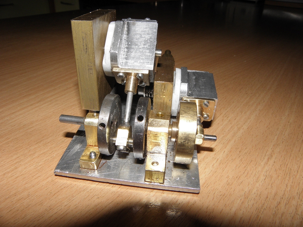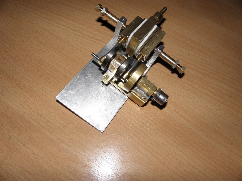 Obvyklou mojí metodou jsem vyrobil duralové hranolky, vyvrtal do nich díry, do nich zasunul a zalepil Ms hlazenou trubičku 10/9 mm délky 27 mm - obsah tohohle válce by měl být úměrný původním 8mm na 20mm a navíc jsem vyrobil malou klikovou hřídelku 4 mm se dvěma ložisky. Původní „klika“ byla jen náhražka 13 mm široká s excentry na obou koncích - to bylo špatné.