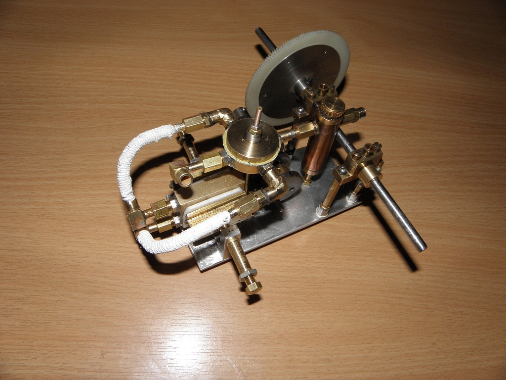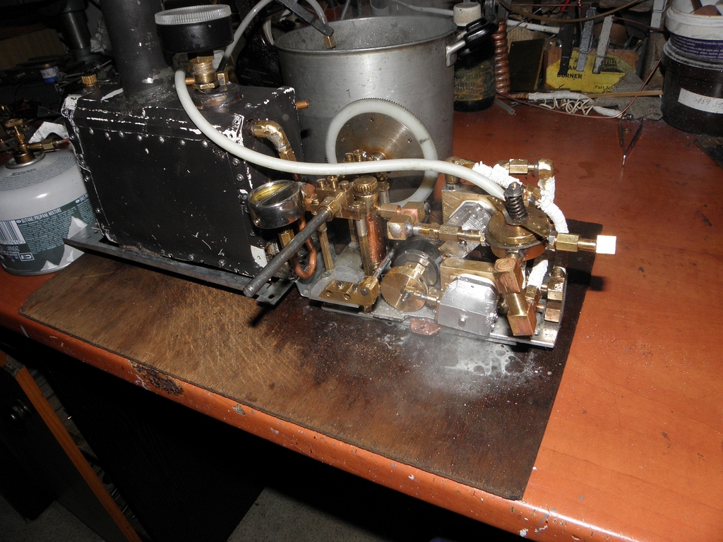 Doma jsem přišel na to, co se vlastně stalo - ochlazovací nádobka byla asi 3x4 cm a vysoká 5 cm (čili asi 60 cm3 což je „velký prcek“), ale kondenzovaná voda nikam neodcházela, nebylo už místo na další nádobku a jen výfuk z ní do komína nebyl k ničemu. Místo páry se i do výfukové trubičky dostala voda (nečekal jsem, že tam bude tolik vody), protože při zkouškách na podzim předchozího roku bylo relativně teplo a kondenzátu bylo málo... a malý výstupní tlak ze strojku nedokázal vyfouknout vodu trubičkou do komína a strojek se zastavil.