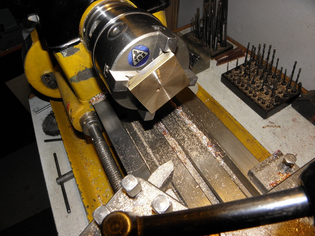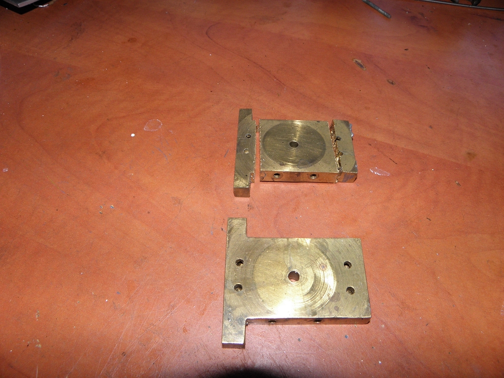 Měl jsem dvě tělíčka s už vyvrtanými technologickými otvory. Chtěl jsem zbytečné zaslepit a udělat nové na menší rozkročení. Naštěstí, nebo naneštěstí, jsem při vrtání jednoho ze dvou tělíček z tvrdé mosazi zlomil vrtáček a bylo to - škoda práce, chtěl jsem využít to, co mi zbylo z předchozí práce na strojku do lodi Léchalas. Ale osud tomu nechtěl.