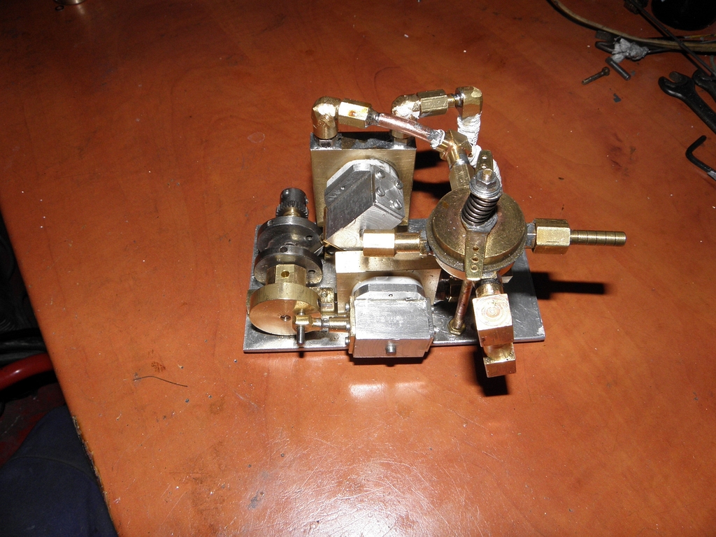 Neumím vyndat zalomený vrtáček z tvrdé mosazi a tak jsem vzal nový kousek měkké mosazi, označil si přepouštěcí otvůrky a vyvrtal je každý o chlup dále od osy než by měl být, takže celkem o asi 1 mm, což pomohlo. Mezi otvůrky je už ploška dlouhá skoro jako otvůrek, což znamená, že strojek může vykonat alespoň nějakou dráhu pod tlakem a tím tedy i práci... Uff.