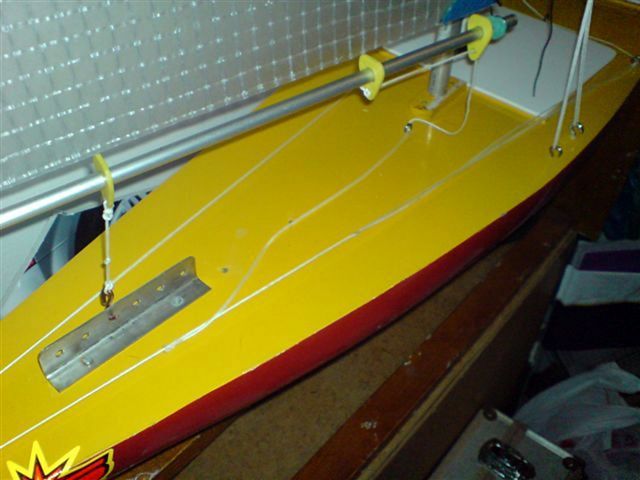 kladkou na přídi. Lanko jde z navijáku ke kladce na přídi a odtamtud rovnou k hlavní plachtě. Cestou je na otěž