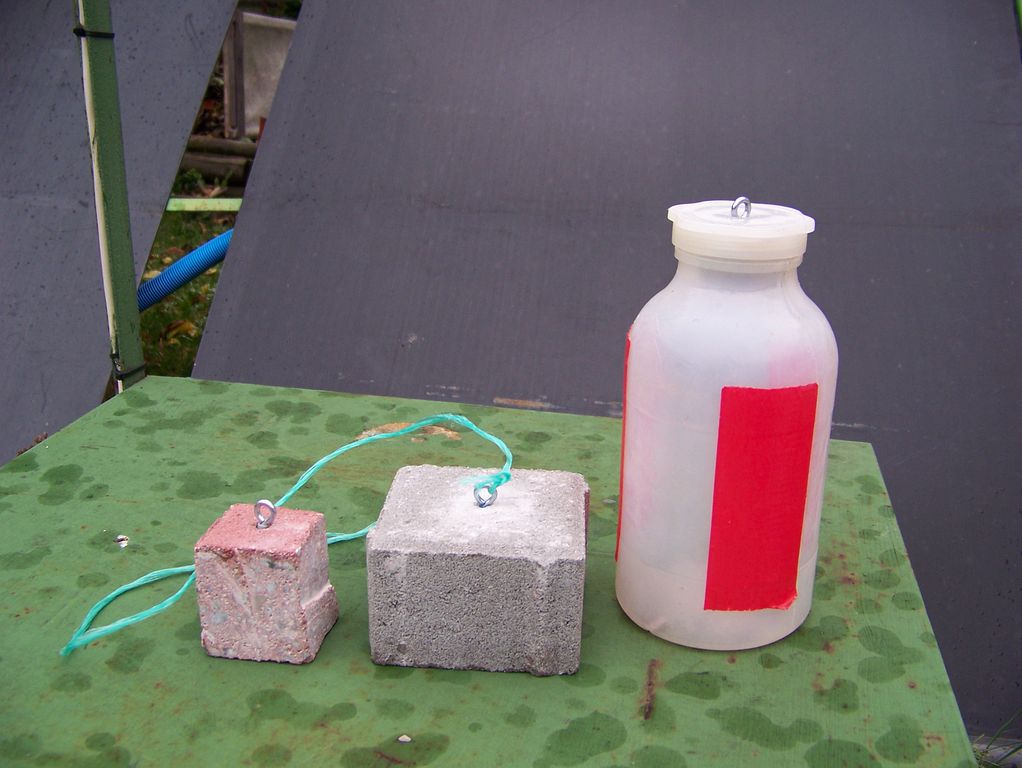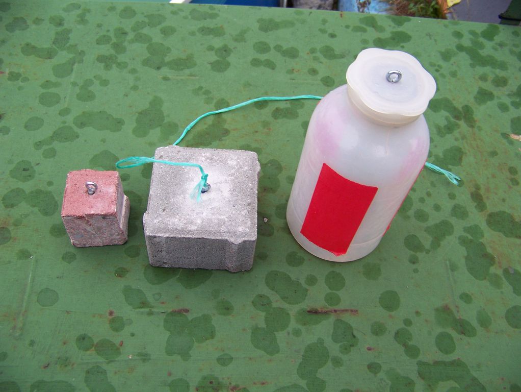 Po půlročním okukování, jak to dělají jinde, jsem se jal konat. Nakoupil jsem kostky zámkové dlažby, nějaké hmoždinky a závitová očka a pustil se do díla. Princip ukotvení je prostý. Mějme větší (kotvící) závaží, které bude ležet na dně a ze kterého povedeme silonový provázek skrz očko vespod bójky do menšího (stabilizačního) závaží. Provázek musí být delší, než je hloubka vody, avšak zase kratší, než je dvojnásobek hloubky vody, aby vše fungovalo.