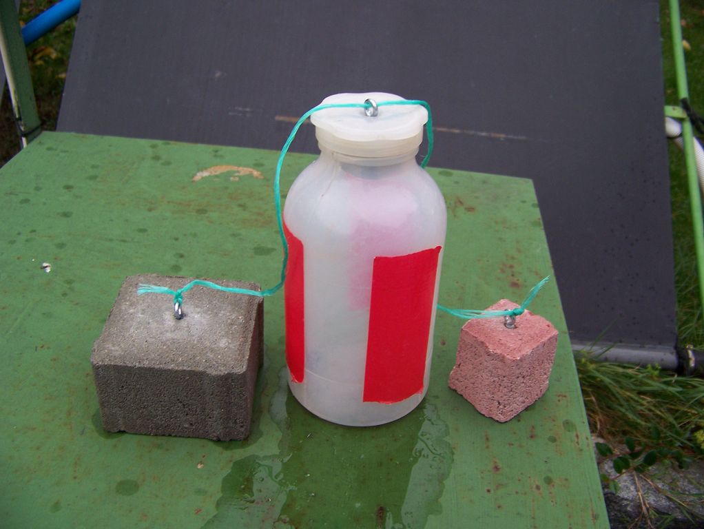 Mnou zvolené bójky pocházejí z litrových umělohmotných láhví s širokým hrdlem z armádního výprodeje, uvnitř kterých je pod víkem kousek překližky, aby závitové očko dobře drželo. Zvenčí jsou pak polepené pruhy barevné lepicí pásky, aby bylo rozeznatelné roztočení bójky při dotyku. Aby taková bójka poslušně stála, tj. byla ponořená do jedné třetiny, použil jsem jako těžší závaží dlaždici čtvercové zámkové dlažby o výšce 6 cm a stranách 10 cm, jejíž hmotnost se po instalaci hmoždinky se závitovým očkem pohybuje kolem 1250 g, jako menší závaží pak posloužila její čtvrtina.