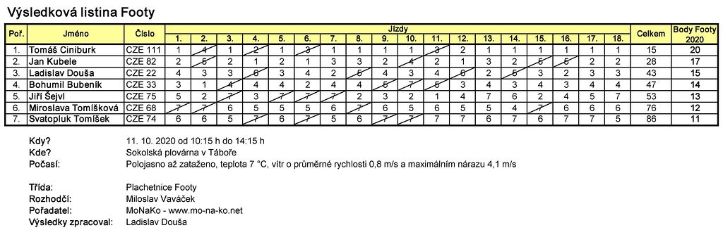 Pátý ročník seriálu soutěží modelů plachetnic Footy v Čechách 2020 jsme úspěšně zakončili v areálu Sokolské plovárny na břehu táborského Jordánu. Neděle 11. října nepatřila mezi nejteplejší dny roku, ale naštěstí nepršelo. Kdo mohl, nejpozději kolem poledne nasadil rukavice a kulicha.