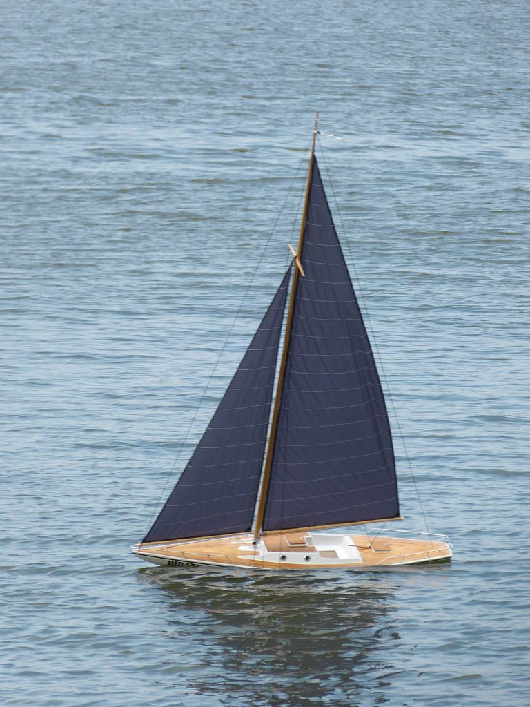 S údivem jsem sledoval, jak si model na své první plavbě povede. Netrvalo dlouho a na bubnu navijáku se zamotalo kevlarové rybářské lano. Jak mi pravil prodavač, udrží stokilového chlapa. Proto není divu, že se mosazný drátek, ztvárňující zavěšení karabiny hlavní plachty, bleskově narovnal. Ještěže tak, také se mohlo stát něco horšího.